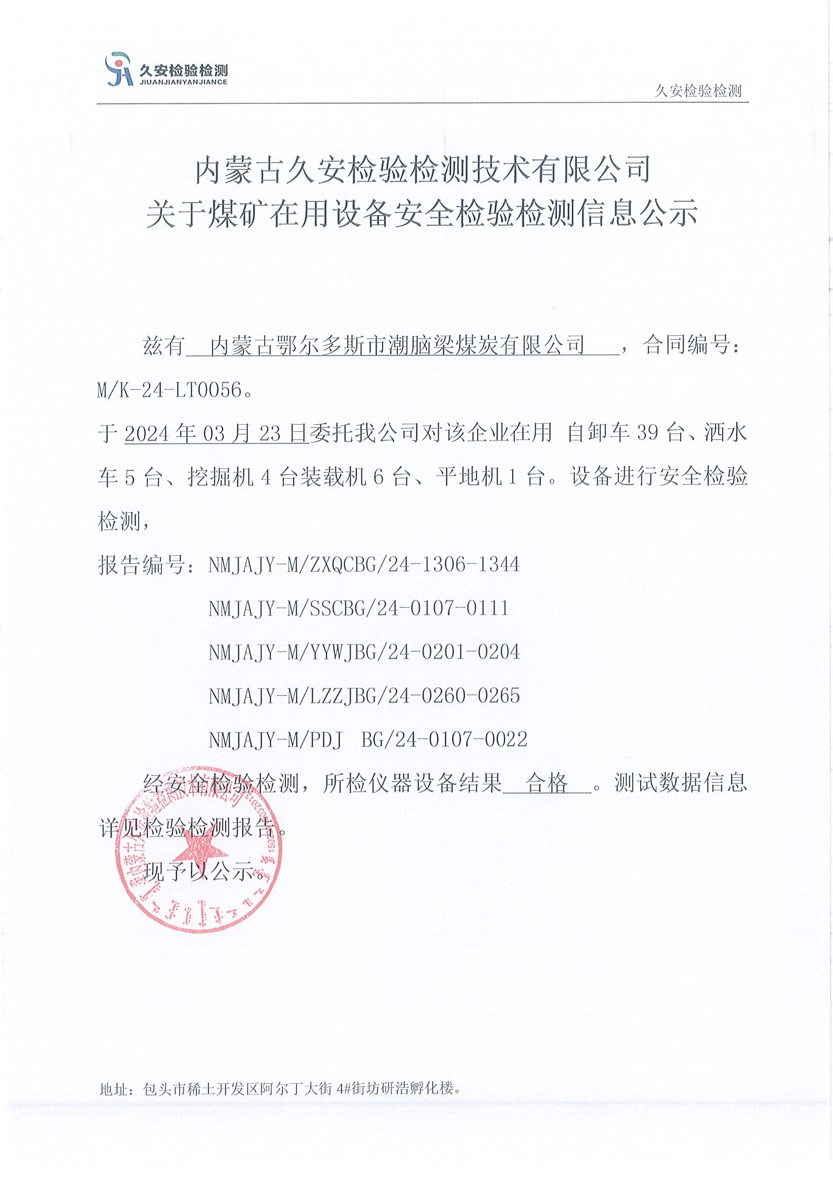 45、内蒙古鄂尔多斯市潮脑梁煤炭有限公司在用设备安全检验检测信息公示