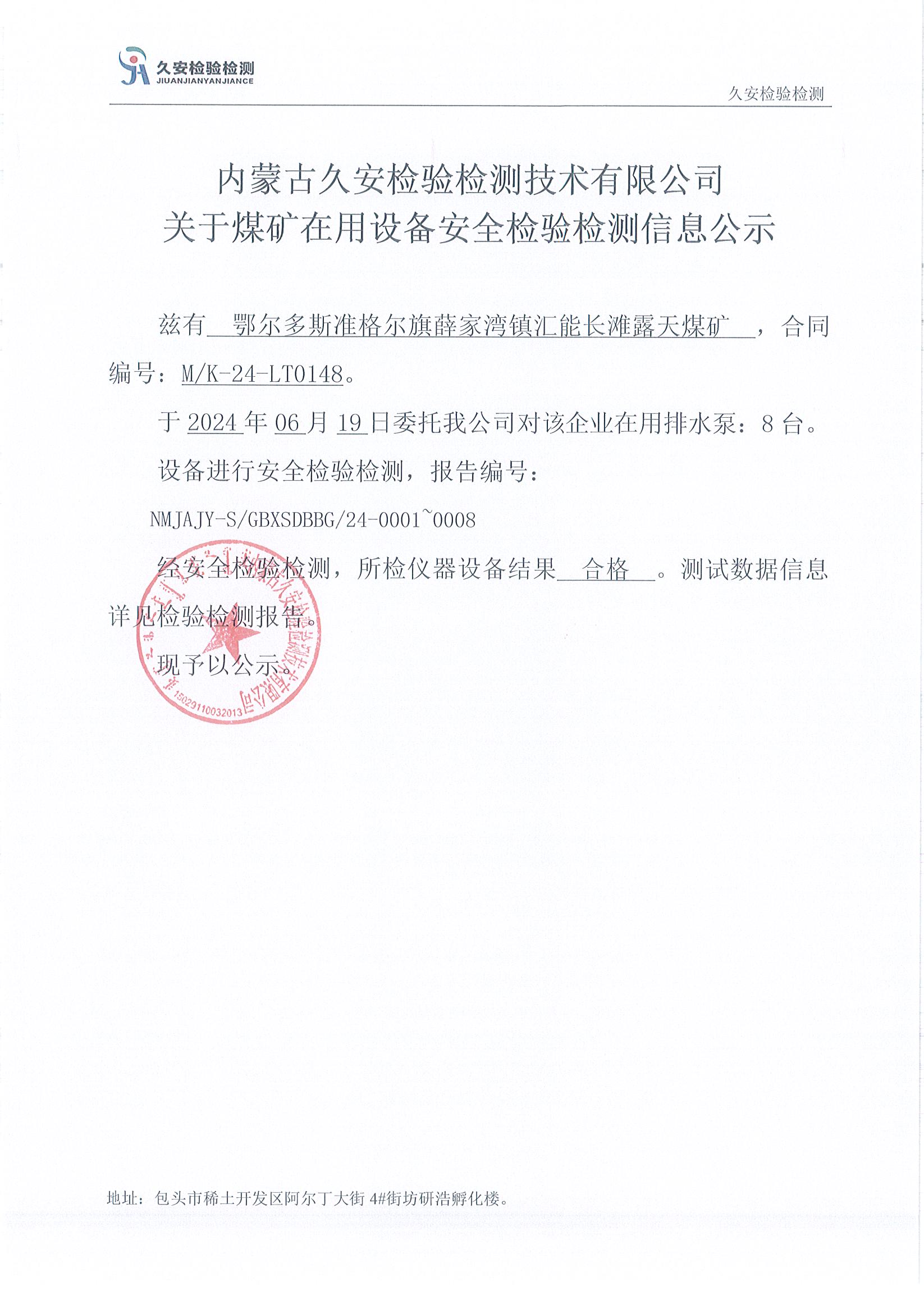 84、鄂尔多斯准格尔旗薛家湾镇汇能长滩露天煤矿在用设备安全检验检测信息公示