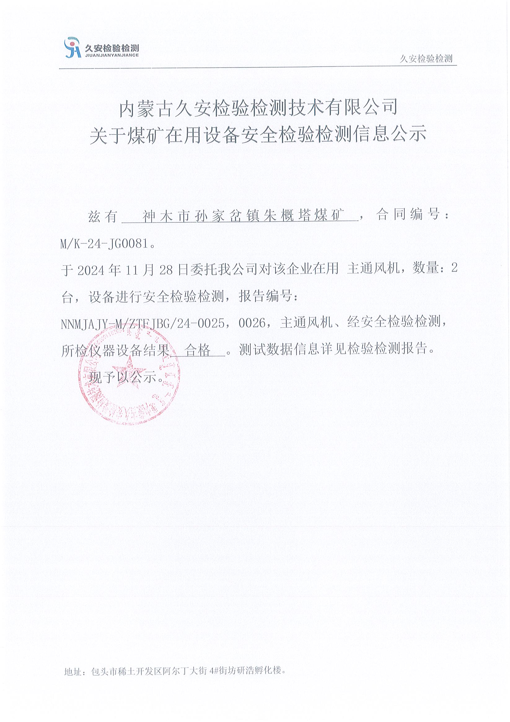 103、神木市孙家岔镇朱概塔煤矿煤矿在用设备安全检验检测信息公示