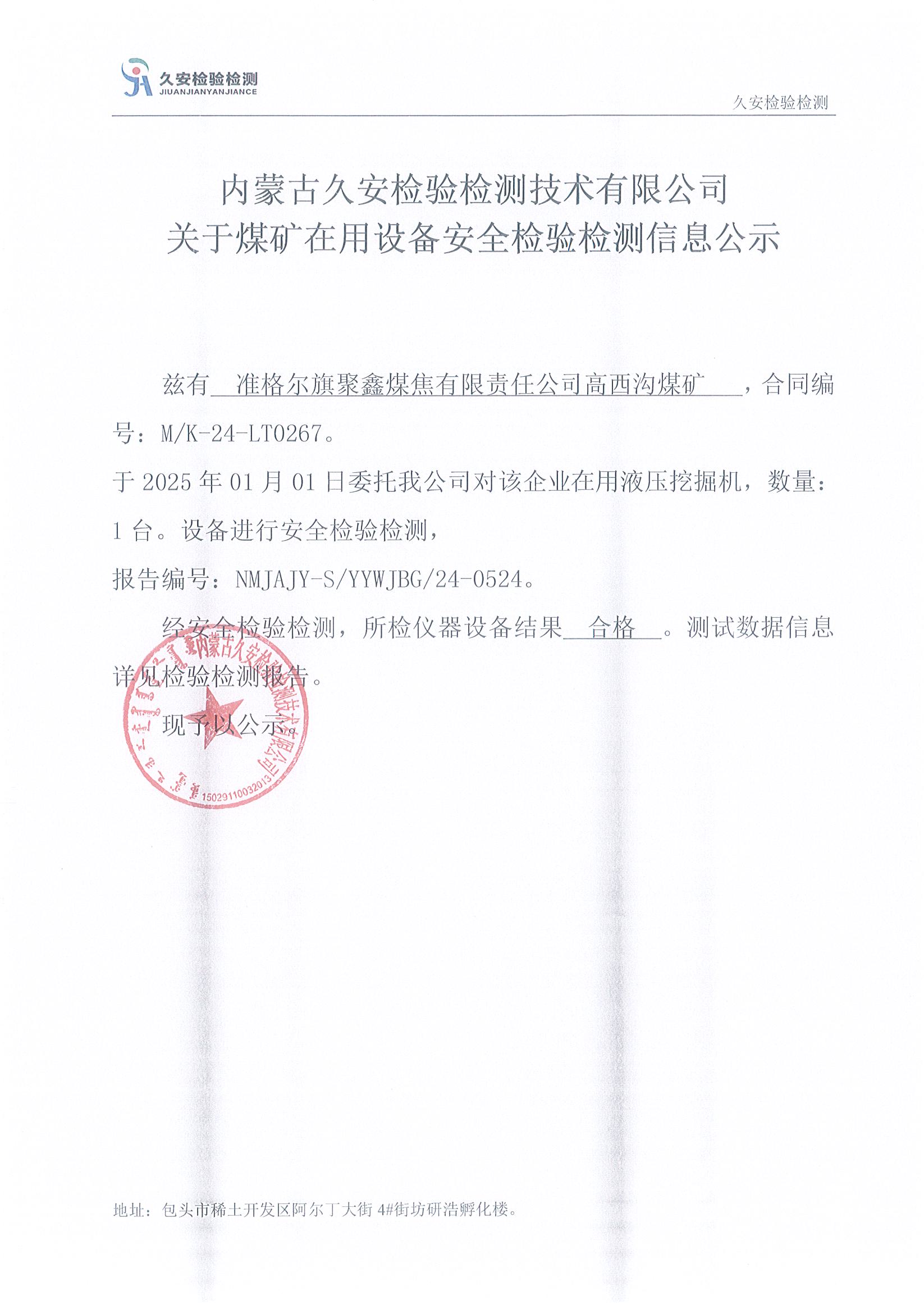 1.准格尔旗聚鑫煤焦有限责任公司高西沟煤矿煤矿在用设备安全检验检测信息公示