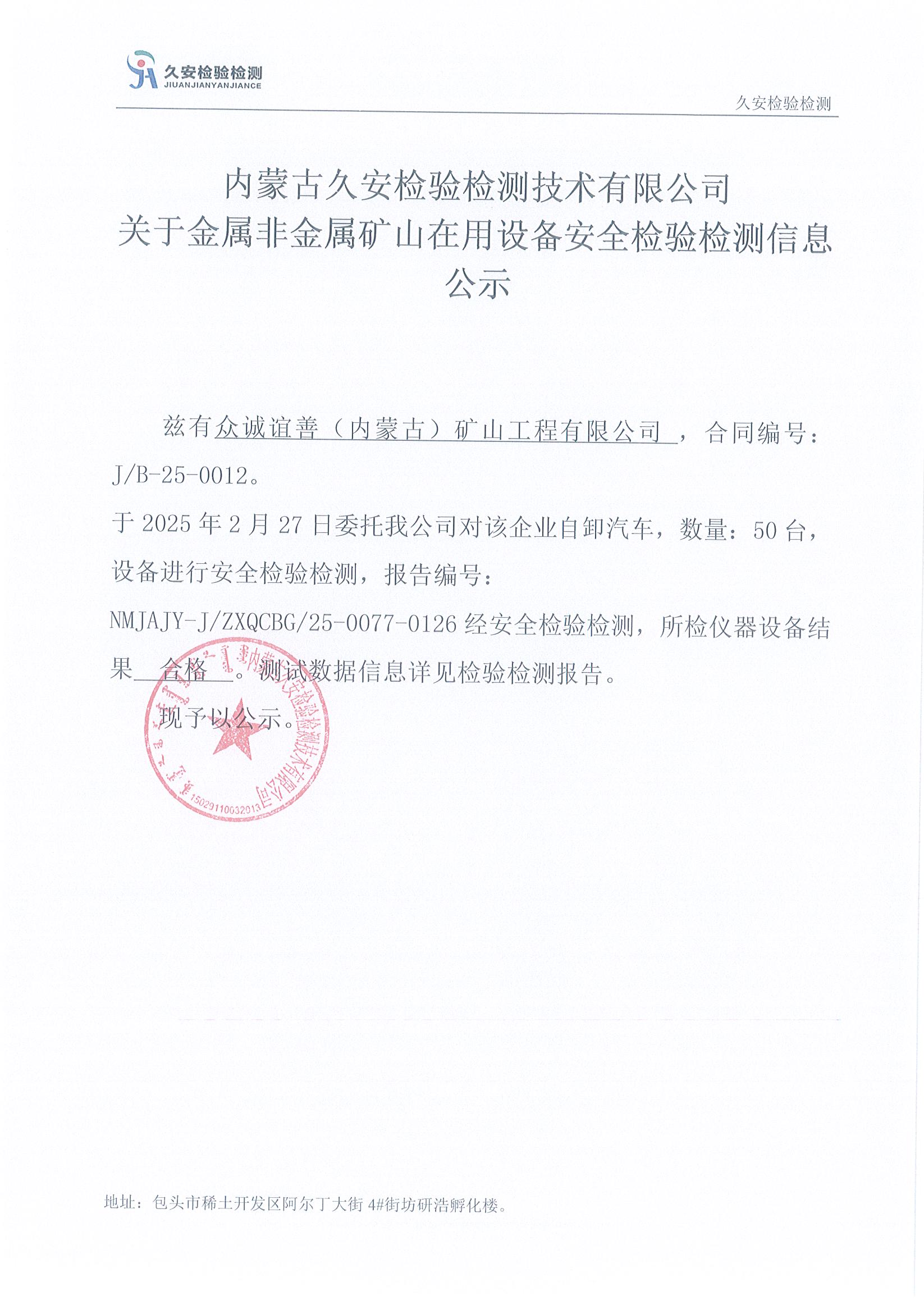 11.众诚谊善(内蒙古)矿山工程有限公司金属非金属矿山在用设备安全检验检测信息公示