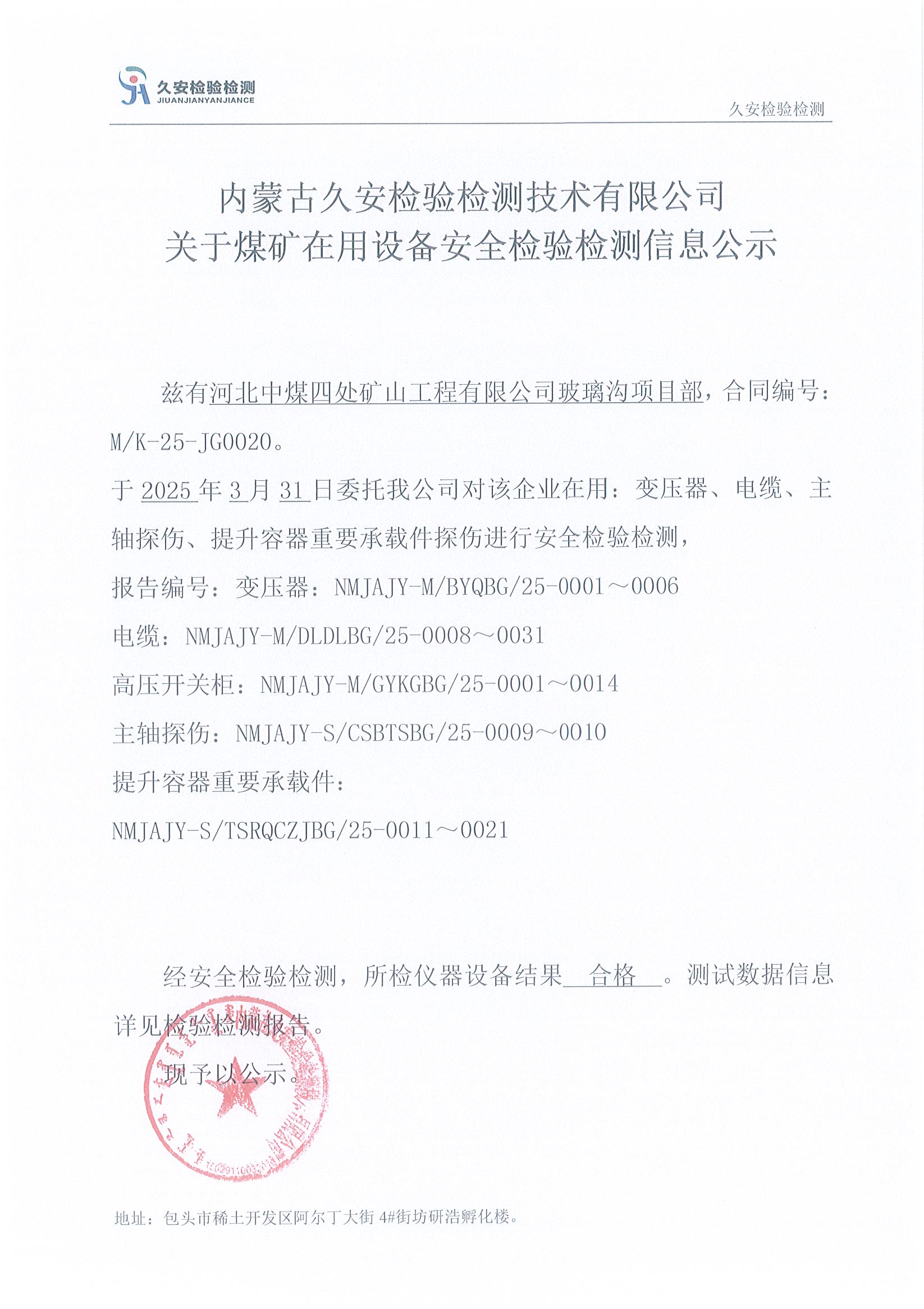 13.河北中煤四处矿山工程有限公司玻璃沟项目部煤矿在用设备安全检验检测信息公示