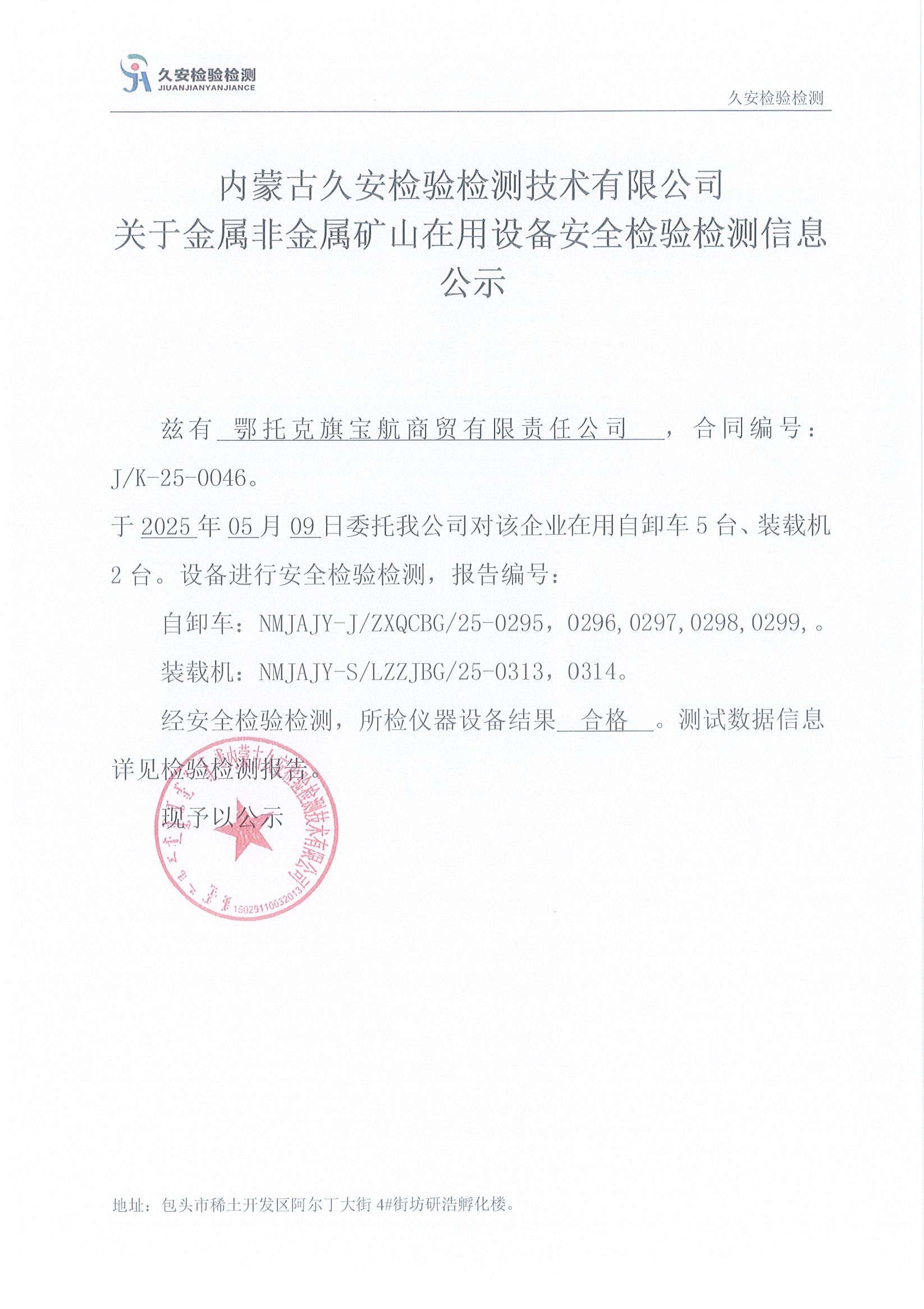 33.鄂托克旗宝航商贸有限责任公司金属非金属矿山在用设备安全检验检测信息公示