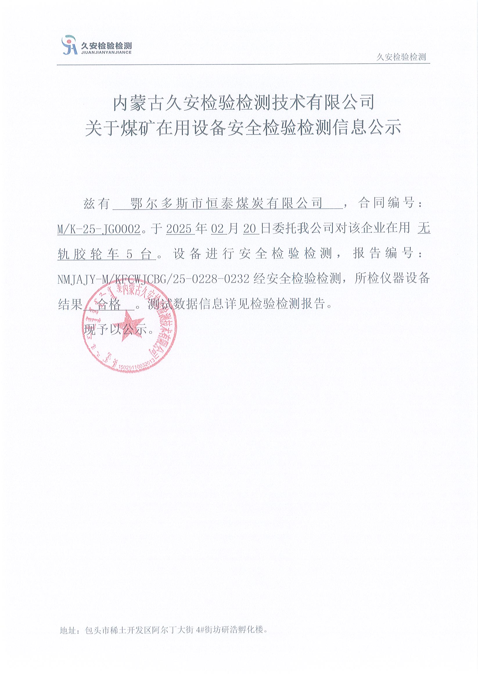 26.鄂尔多斯市恒泰煤炭有限公司煤矿在用设备安全检验检测信息公示