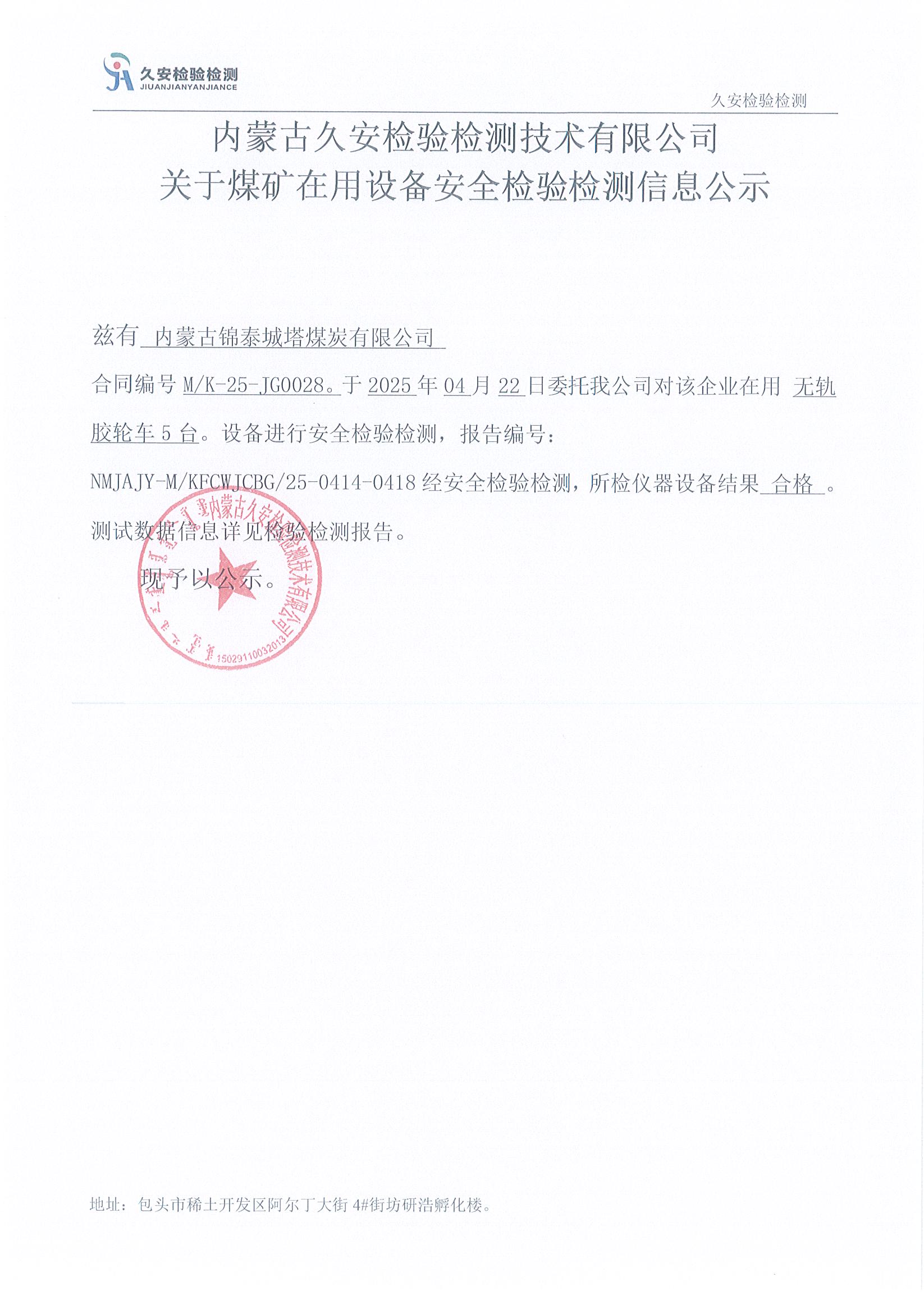 37.内蒙古锦泰城塔煤炭有限公司 煤矿在用设备安全检验检测信息公示