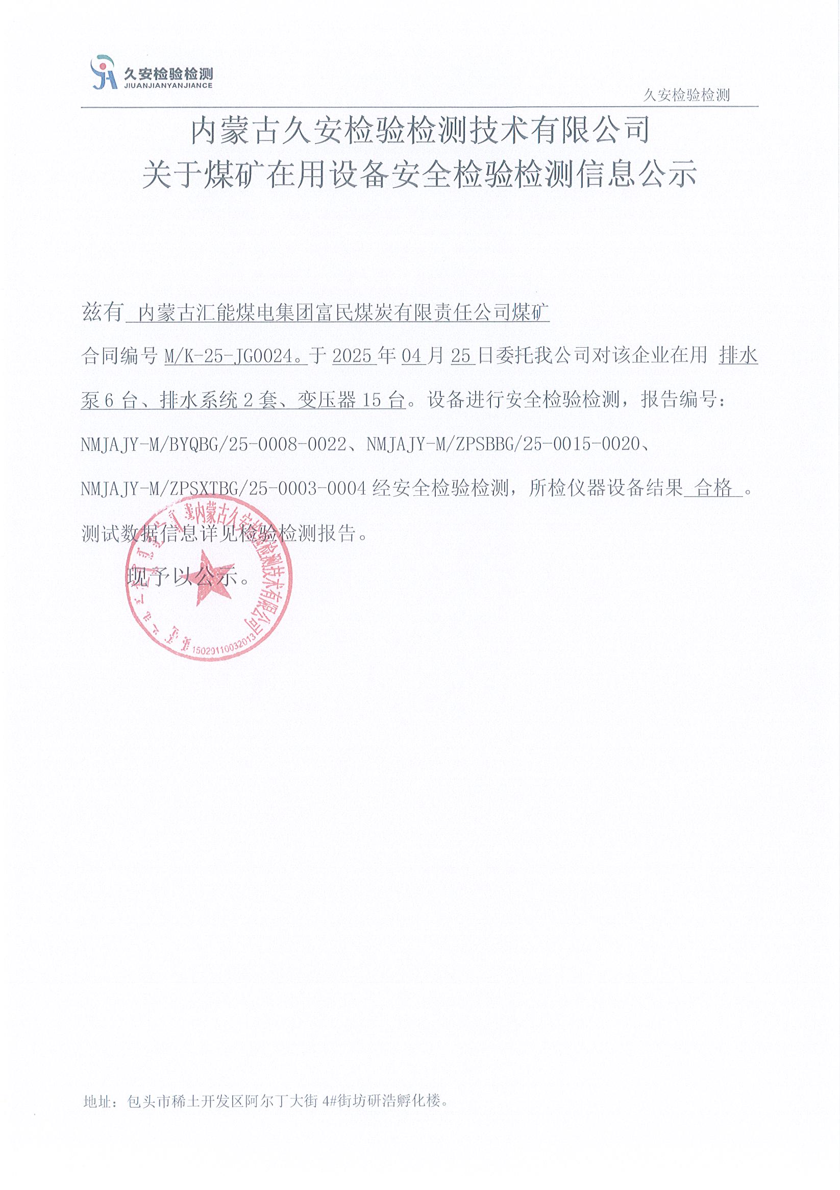 39.内蒙古汇能煤电集团富民煤炭有限责任公司煤矿煤矿在用设备安全检验检测信息公示