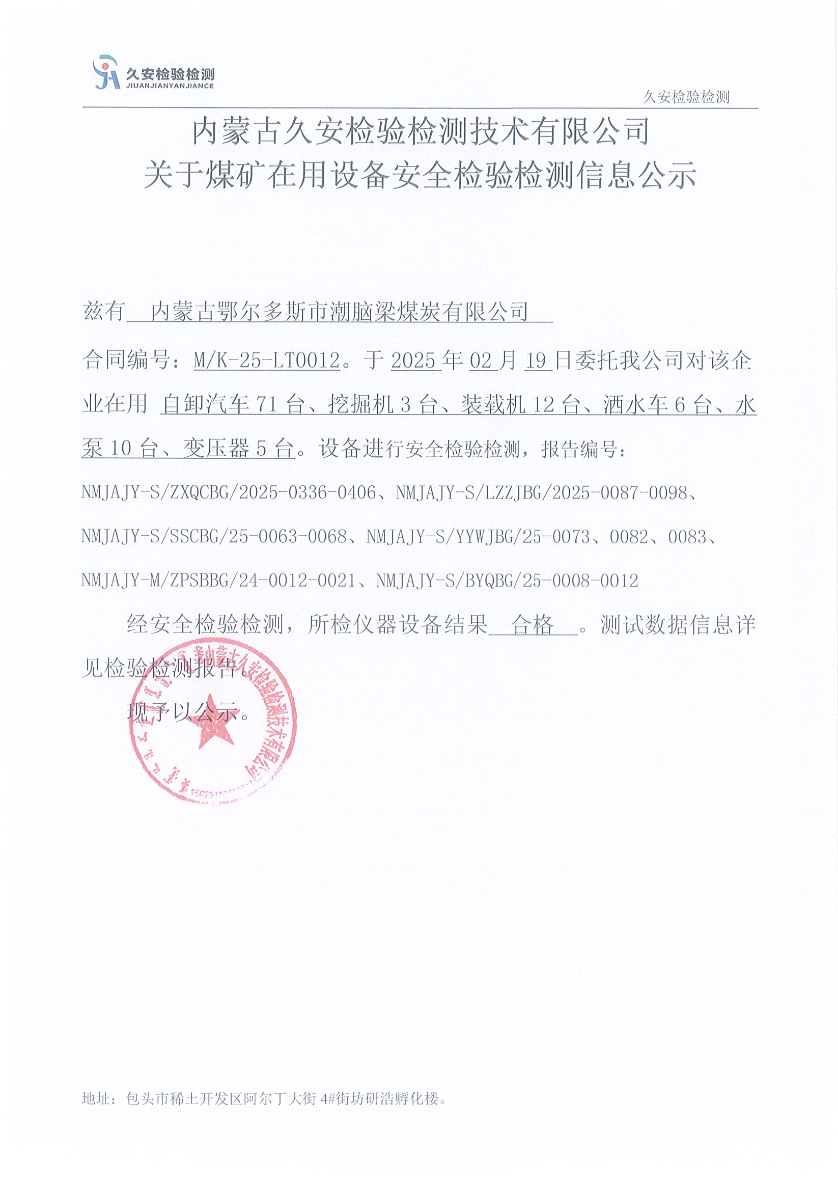 27.内蒙古鄂尔多斯市潮脑梁煤炭有限公司煤矿在用设备安全检验检测信息公示