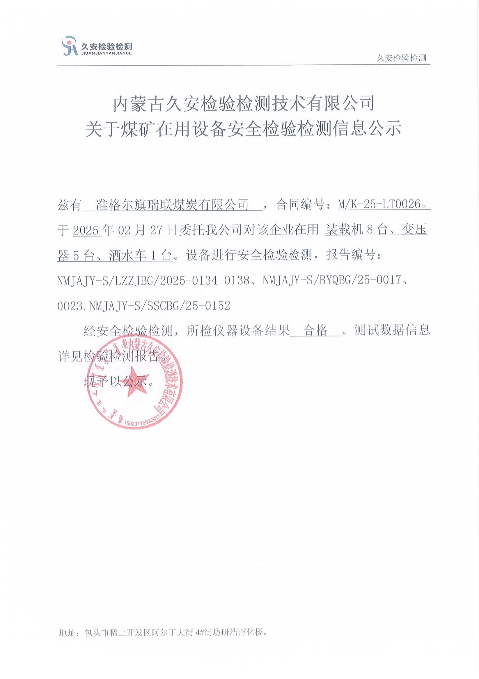 38.准格尔旗瑞联煤炭有限公司煤矿在用设备安全检验检测信息公示