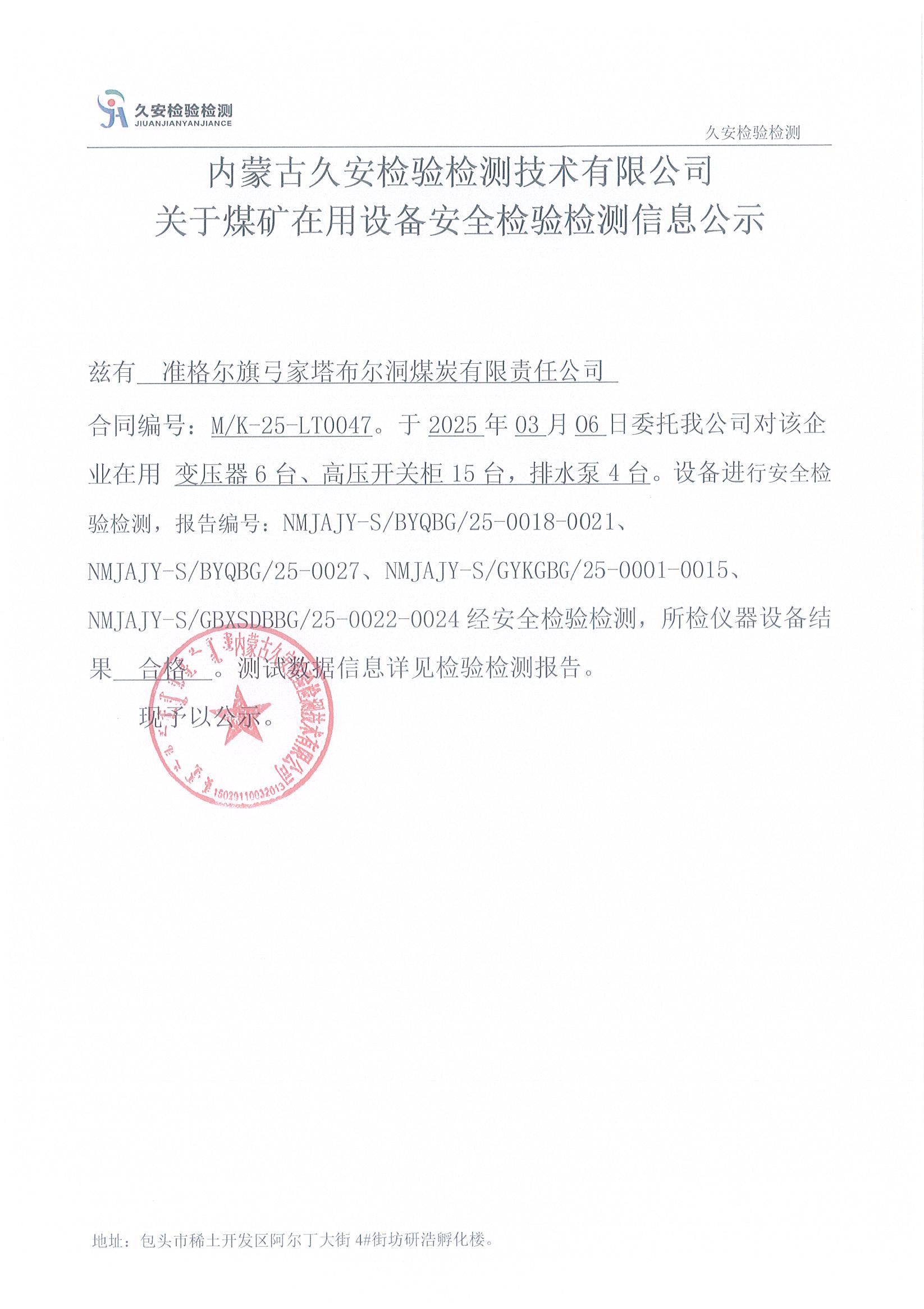 42.准格尔旗弓家塔布尔洞煤炭有限责任公司煤矿在用设备安全检验检测信息公示