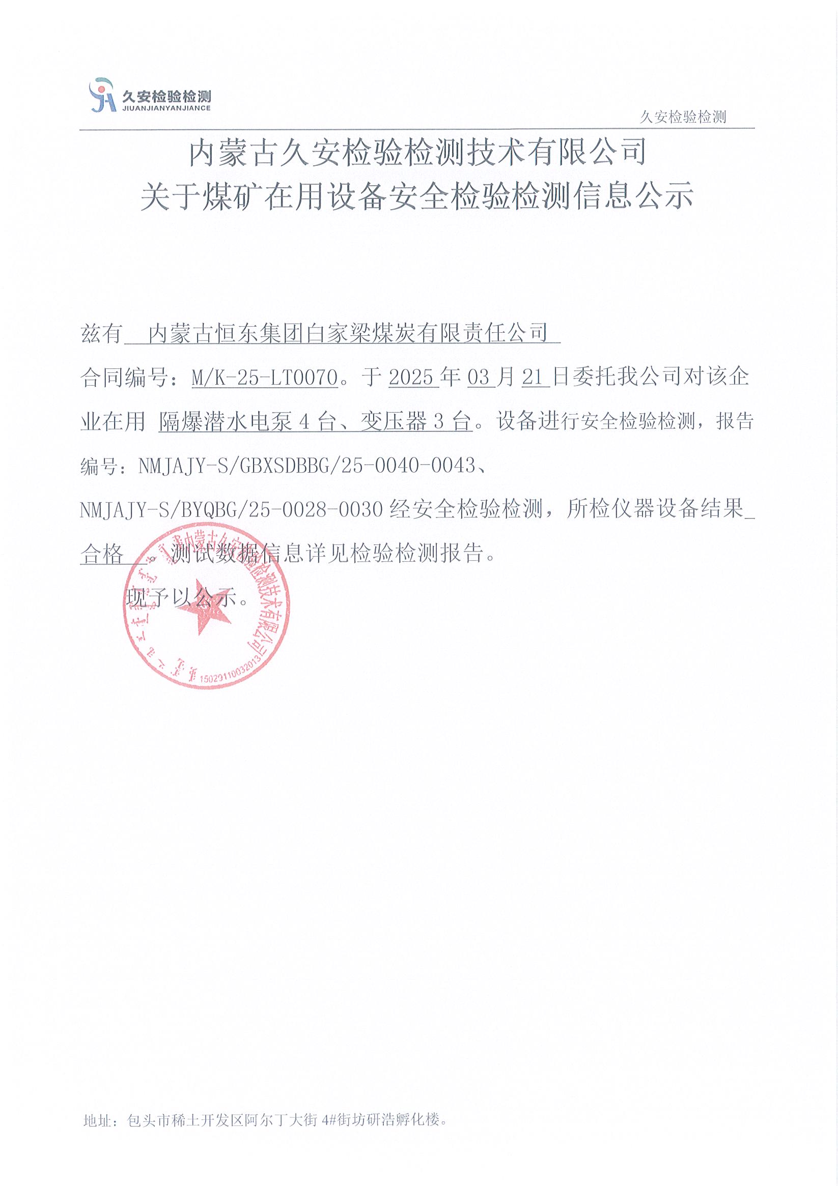 46.内蒙古恒东集团白家梁煤炭有限责任公司煤矿在用设备安全检验检测信息公示