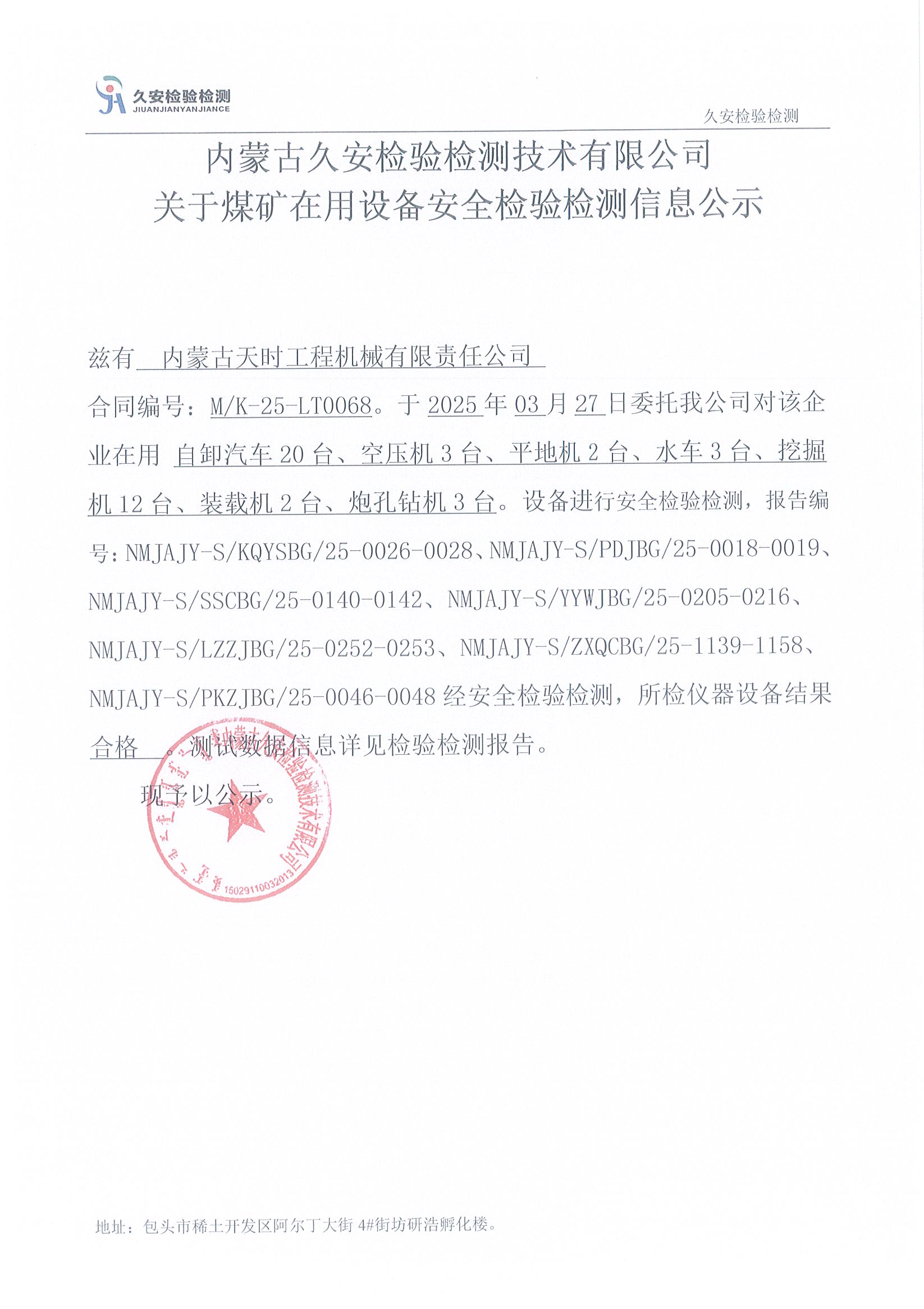 56.内蒙古天时工程机械有限责任公司煤矿在用设备安全检验检测信息公示
