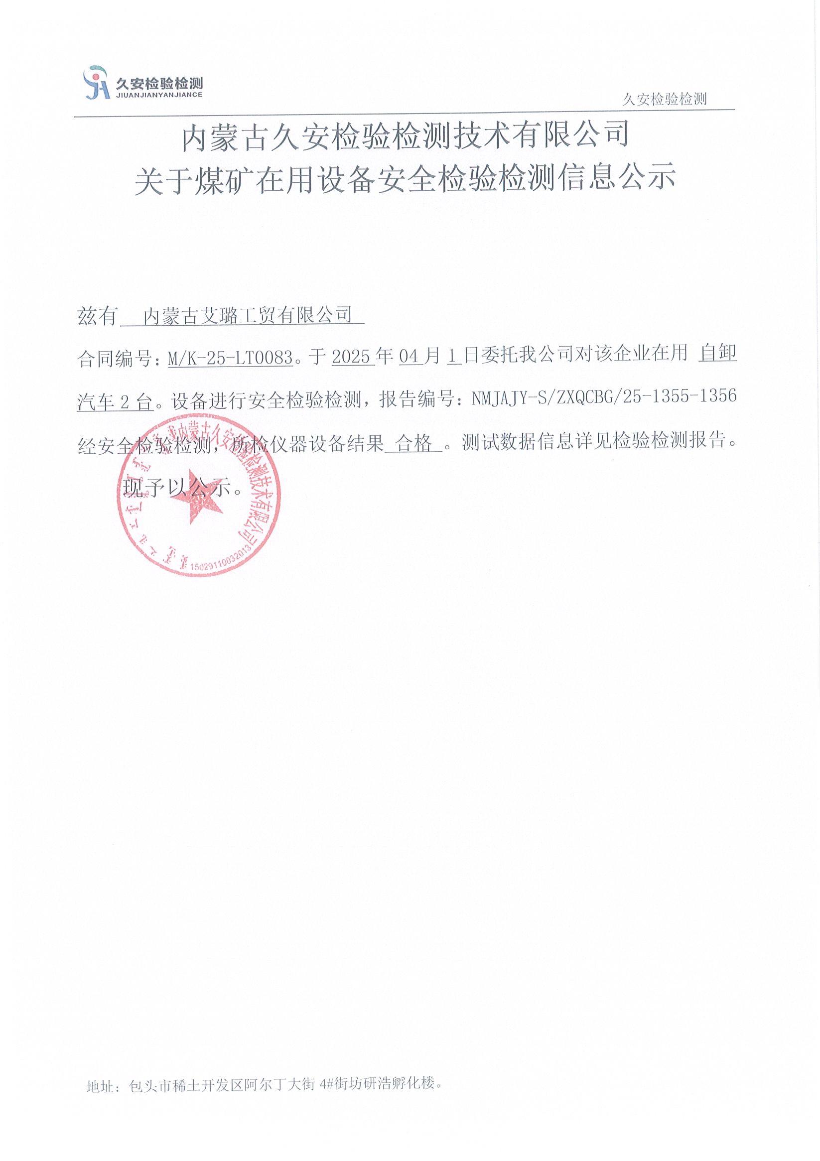 59.内蒙古艾璐工贸有限公司煤矿在用设备安全检验检测信息公示