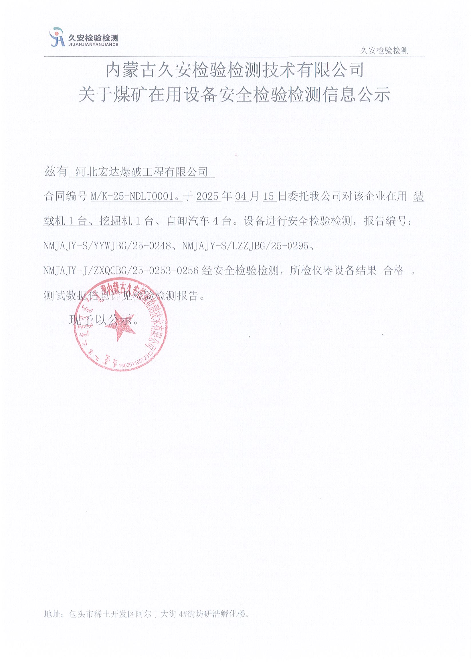 67.河北宏达爆破工程有限公司煤矿在用设备安全检验检测信息公示