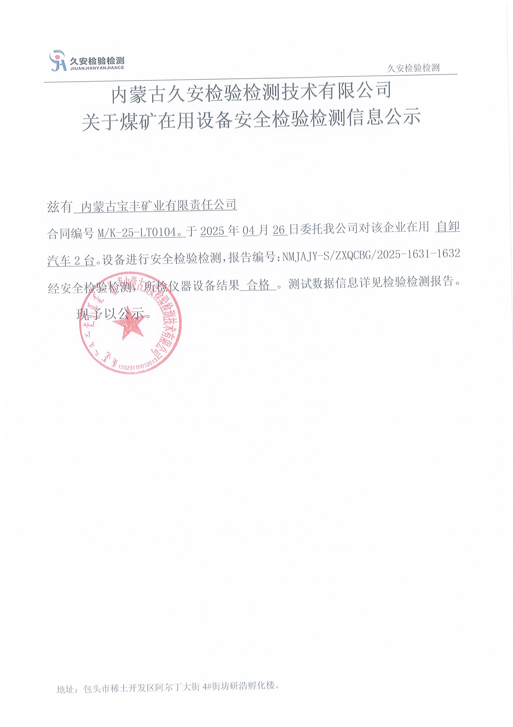 72.内蒙古宝丰矿业有限责任公司煤矿在用设备安全检验检测信息公示