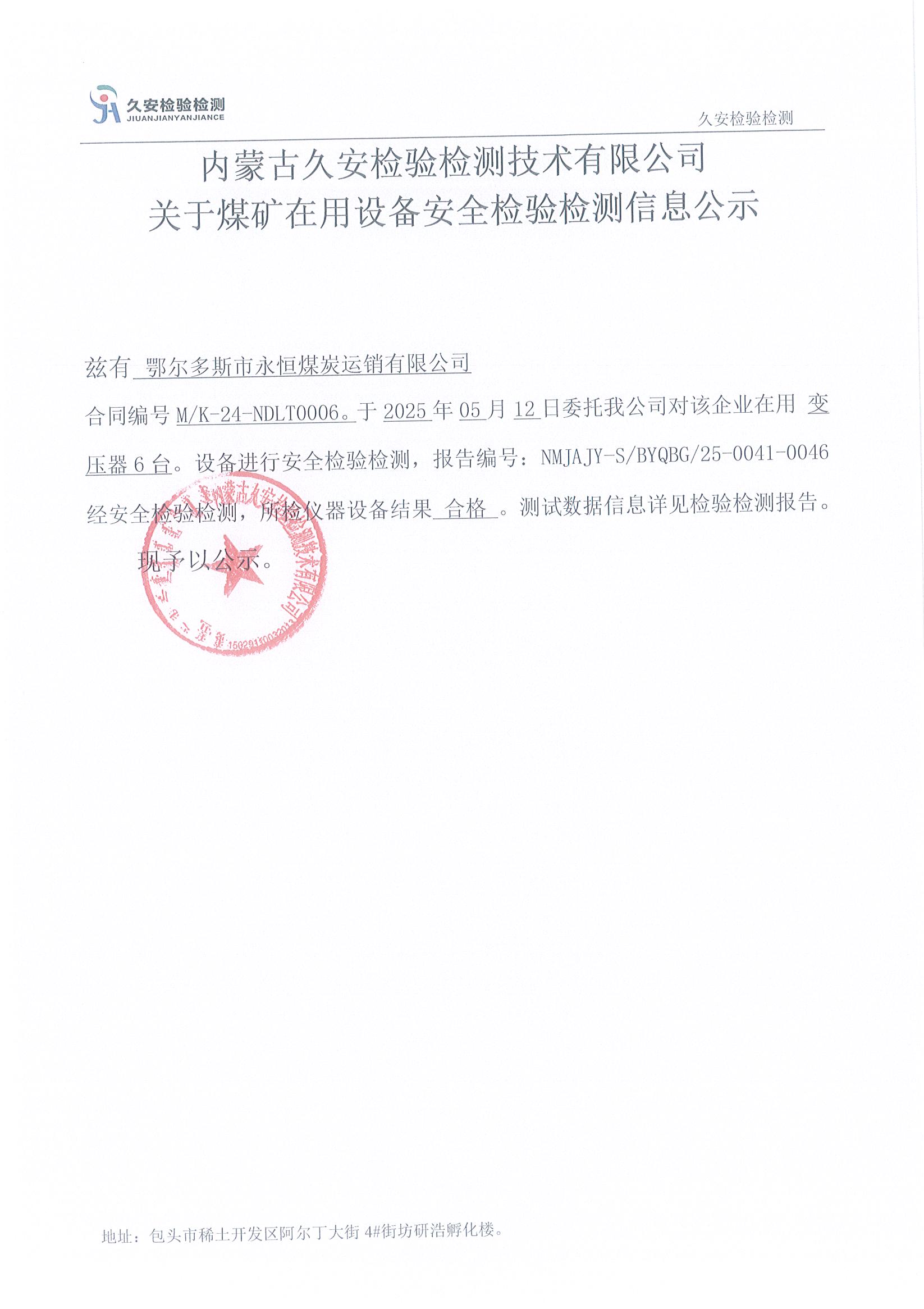 76.鄂尔多斯市永恒煤炭运销有限公司煤矿在用设备安全检验检测信息公示