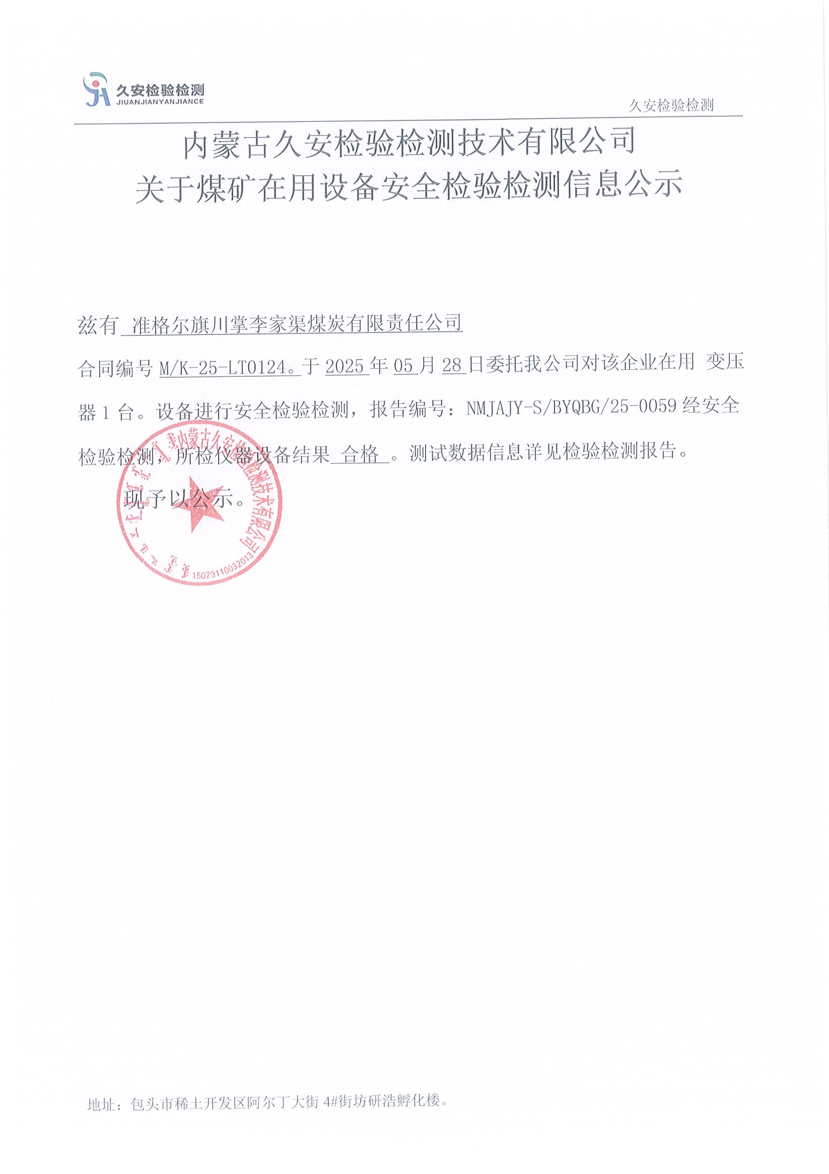 84.准格尔旗川掌李家渠煤炭有限责任公司煤矿在用设备安全检验检测信息公示