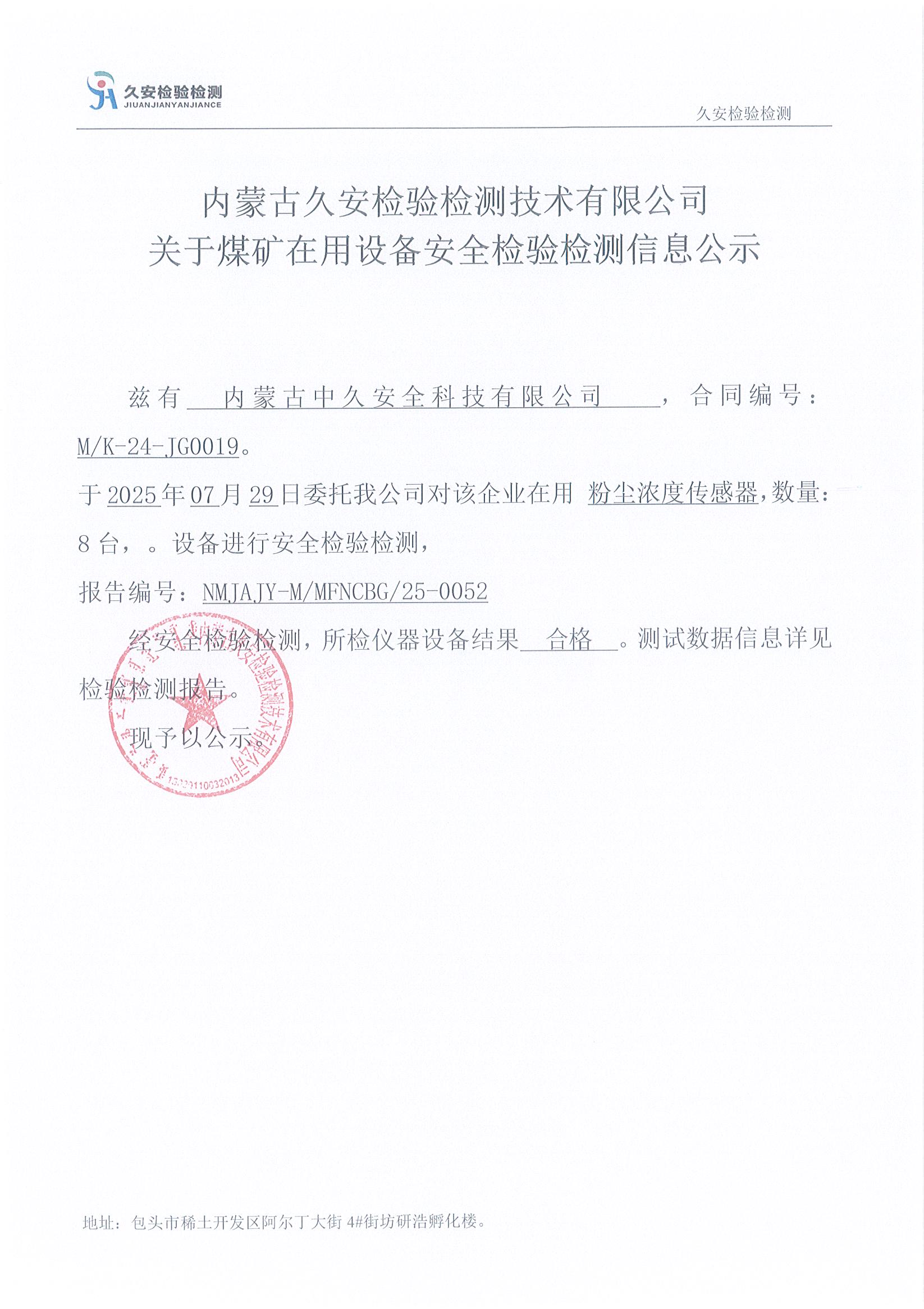 2、内蒙古中久安全科技有限公司煤矿在用设备安全检验检测信息公示