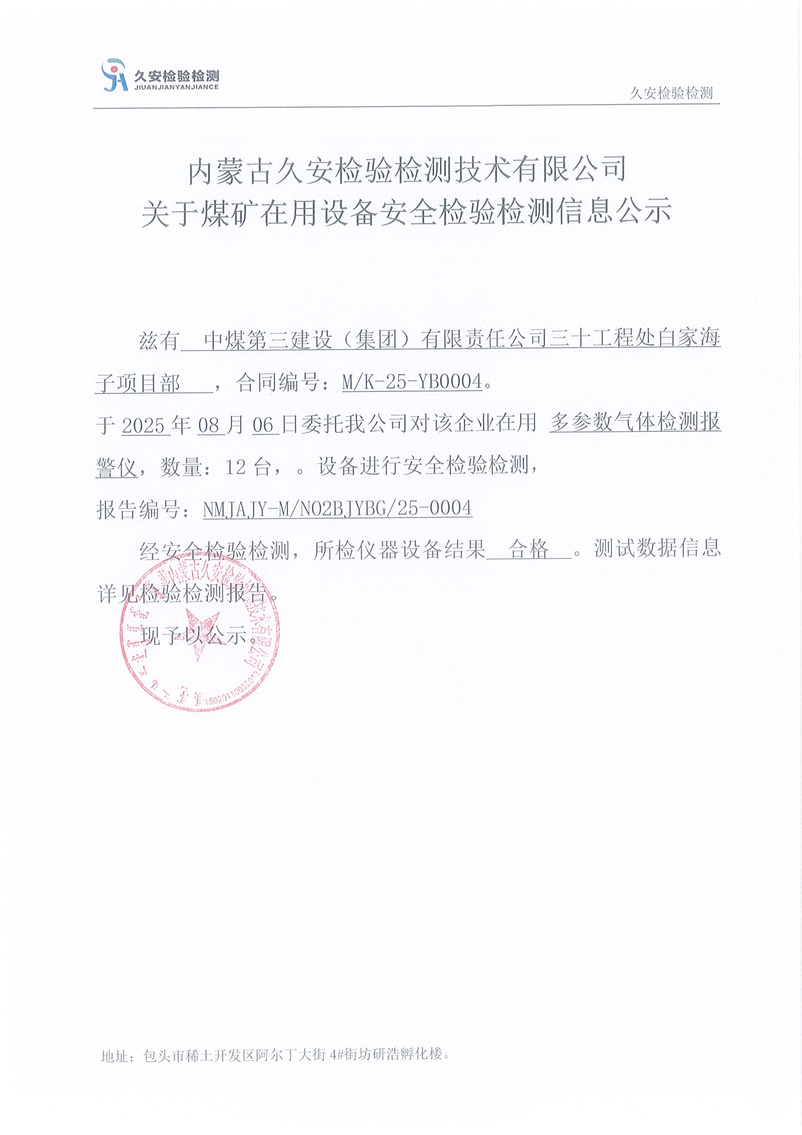 12、中煤第三建设(集团)有限责任公司三十工程处白家海子项目部煤矿在用设备安全检验检测信息公示
