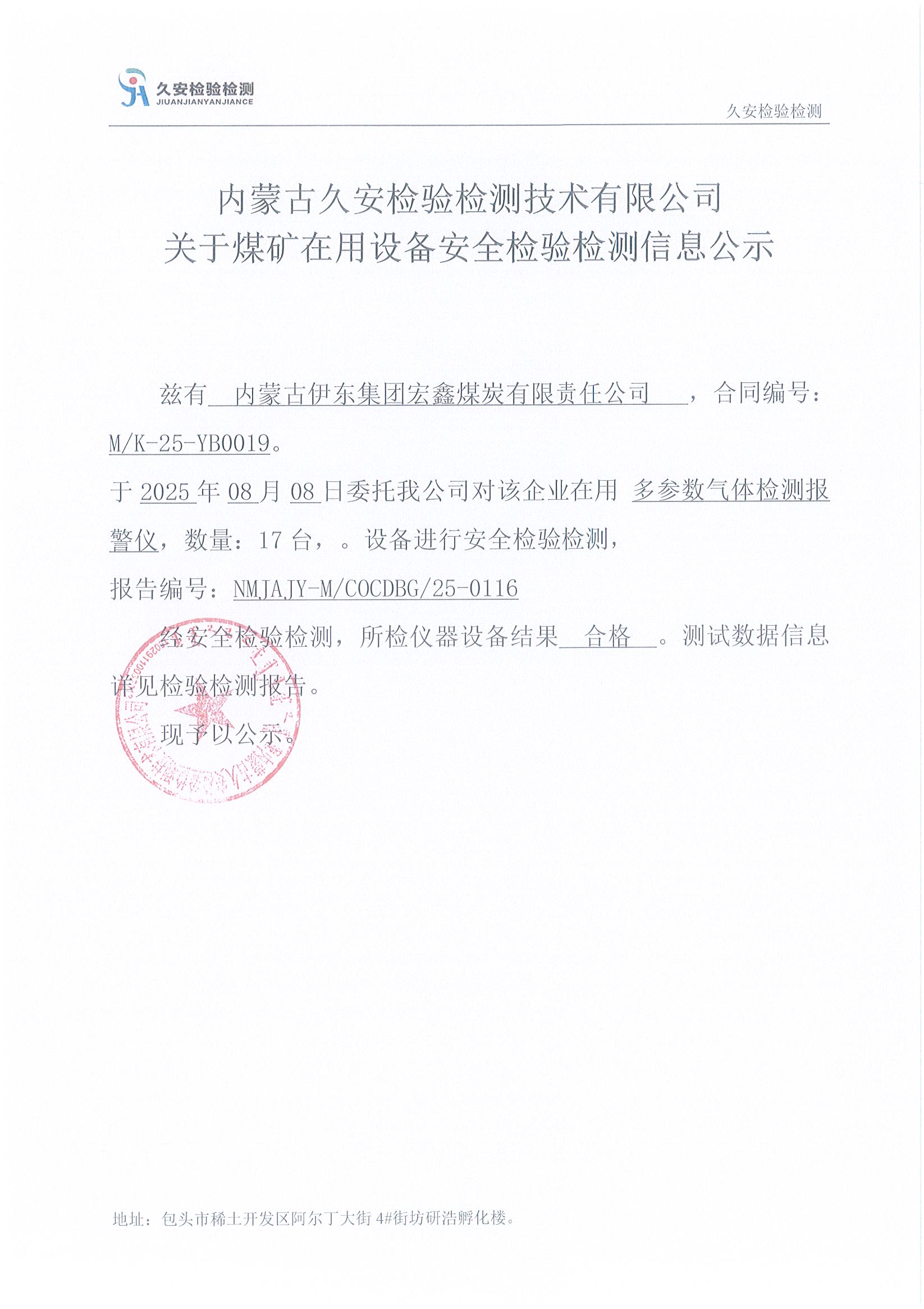 27、内蒙古伊东集团宏鑫煤炭有限责任公司 煤矿在用设备安全检验检测信息公示