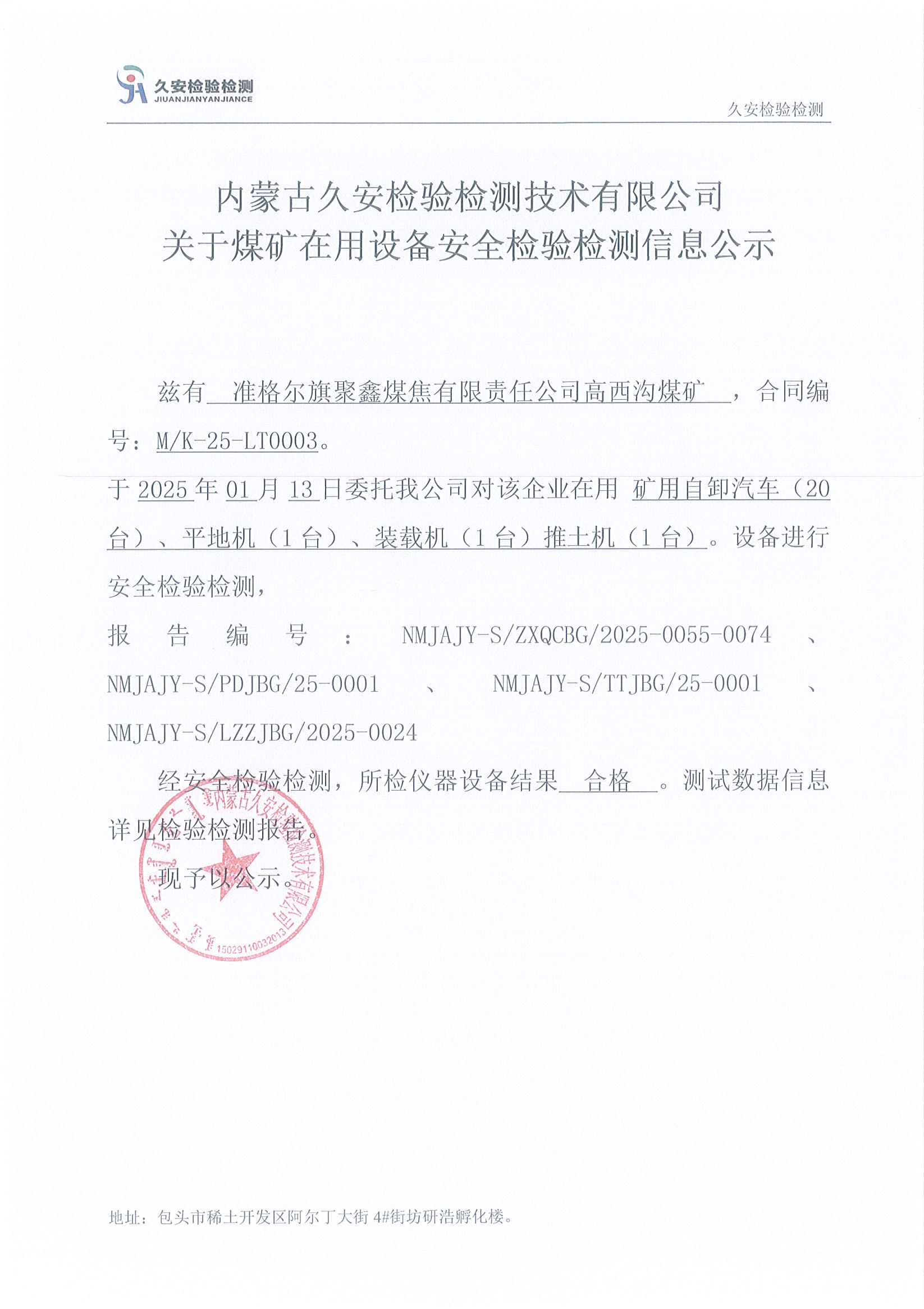 119.准格尔旗聚鑫煤焦有限责任公司高西沟煤矿煤矿在用设备安全检验检测信息公示