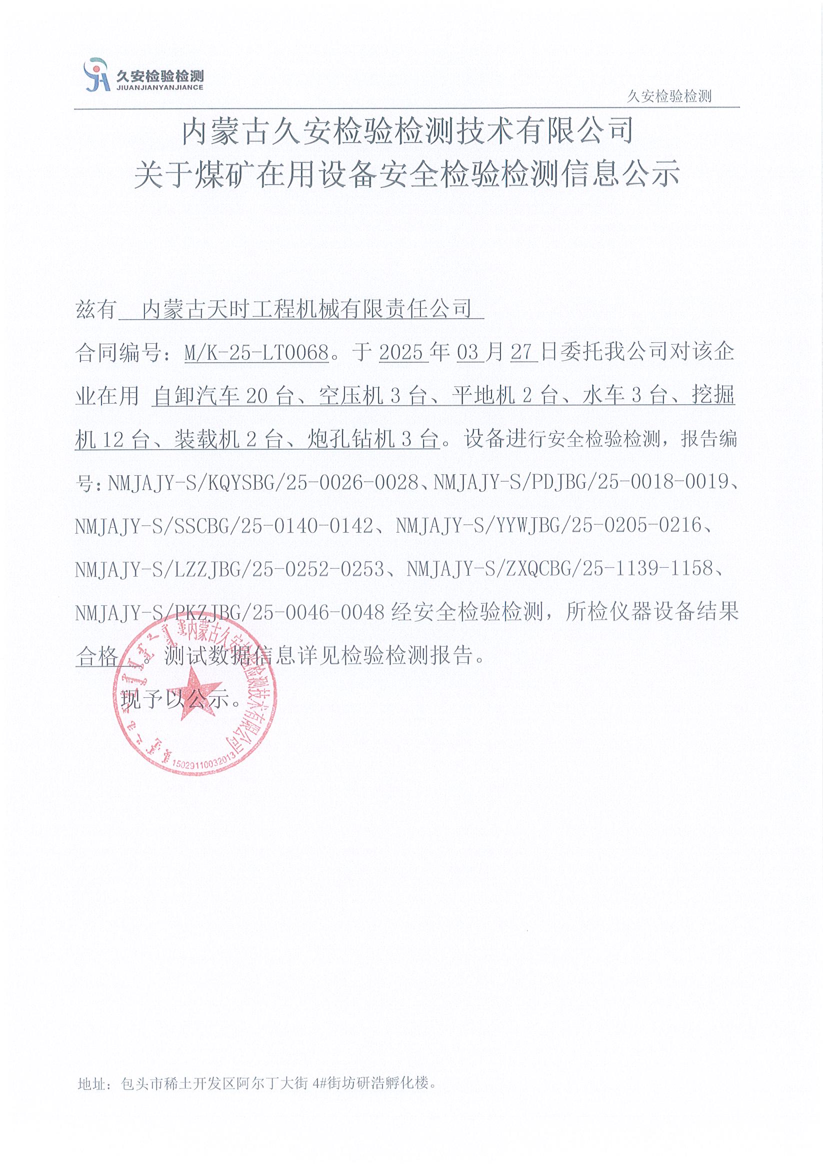 121.内蒙古天时工程机械有限责任公司煤矿在用设备安全检验检测信息公示