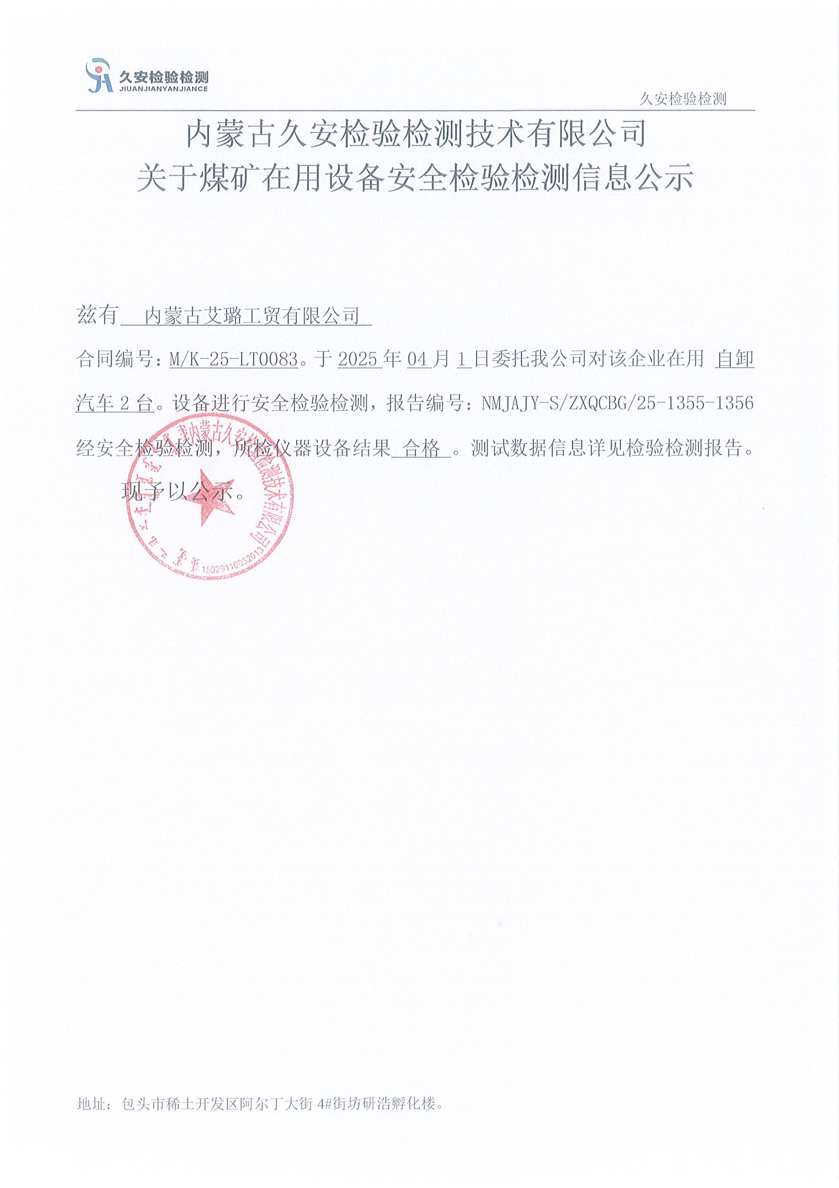 124.内蒙古艾璐工贸有限公司 煤矿在用设备安全检验检测信息公示