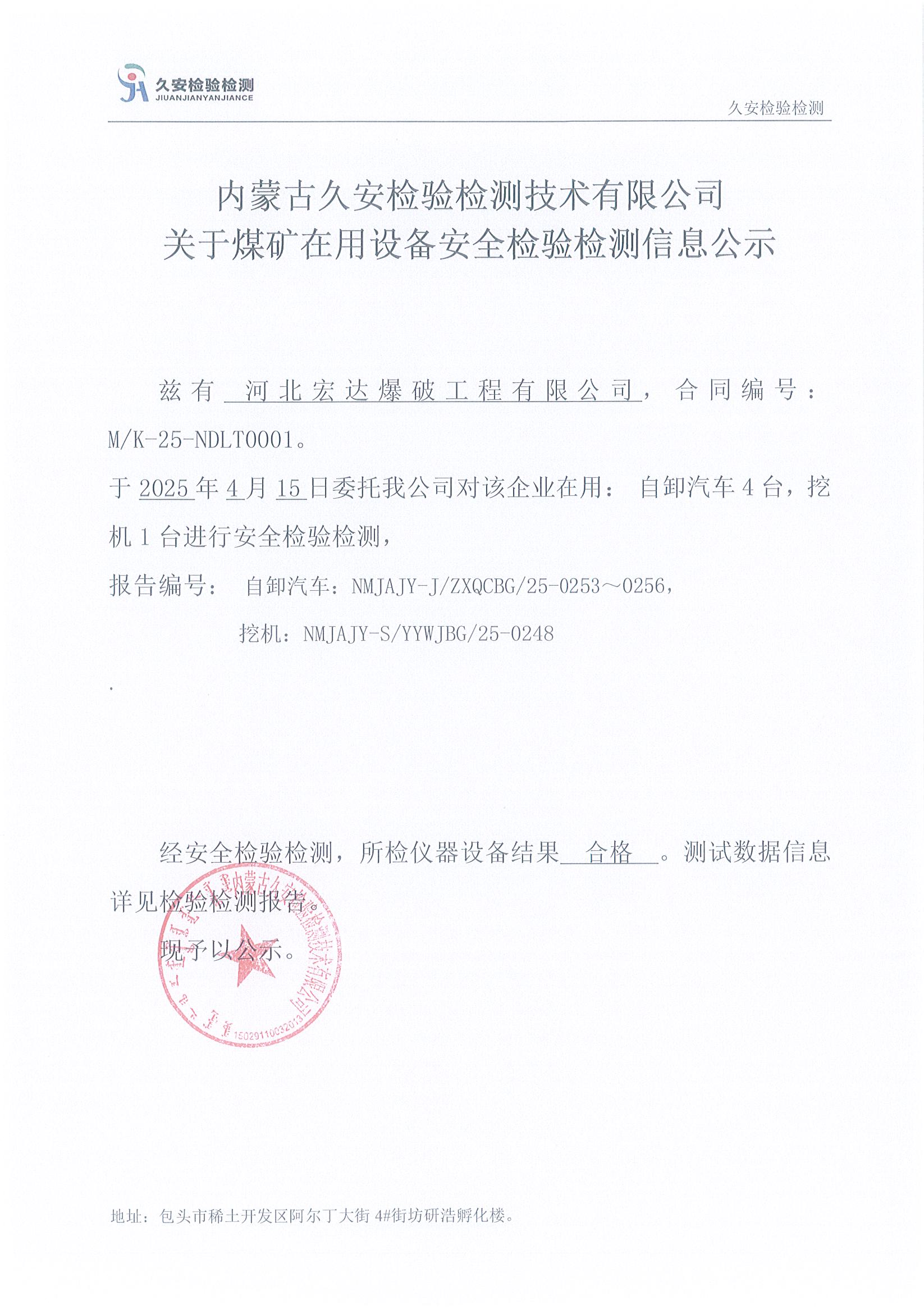 125.河北宏达爆破工程有限公司煤矿在用设备安全检验检测信息公示