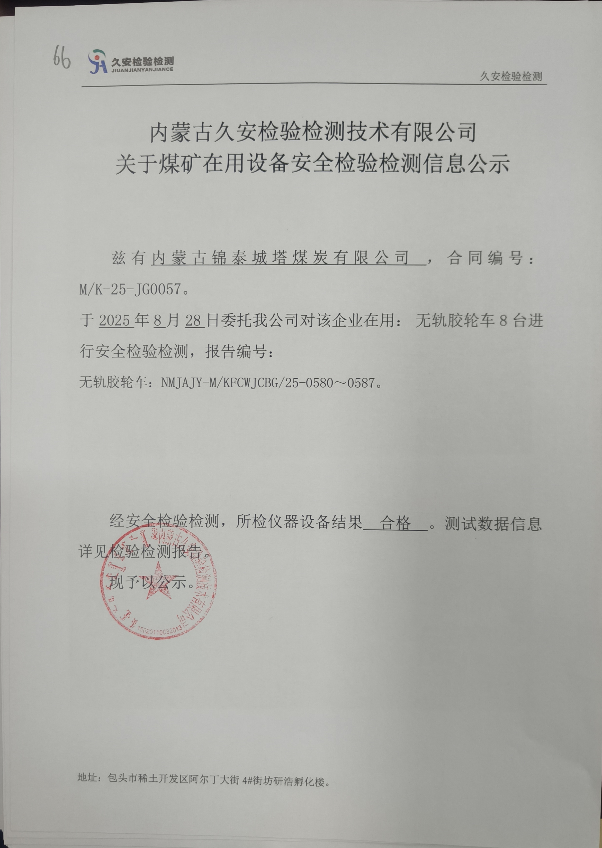 66.内蒙古锦泰城塔煤炭有限公司煤矿在用设备安全检验检测信息公示