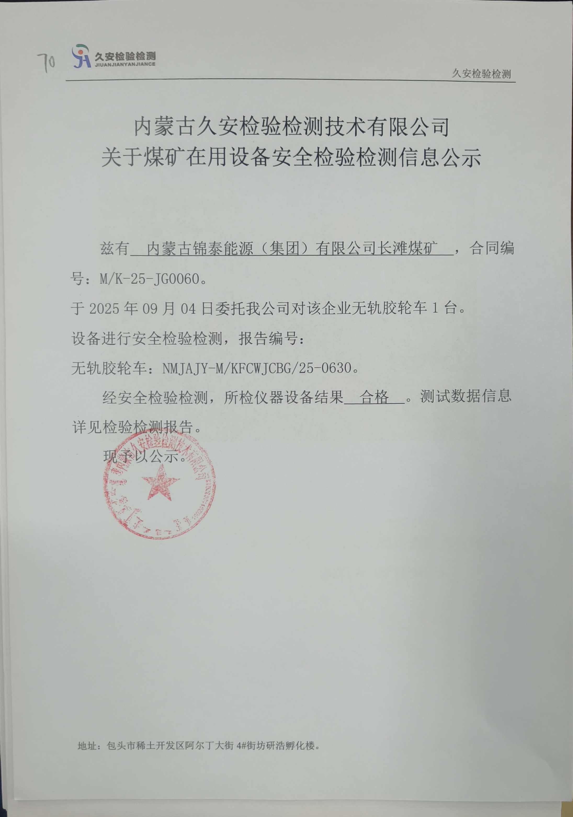 70.内蒙古锦泰能源(集团)有限公司长滩煤矿在用设备安全检验检测信息公示