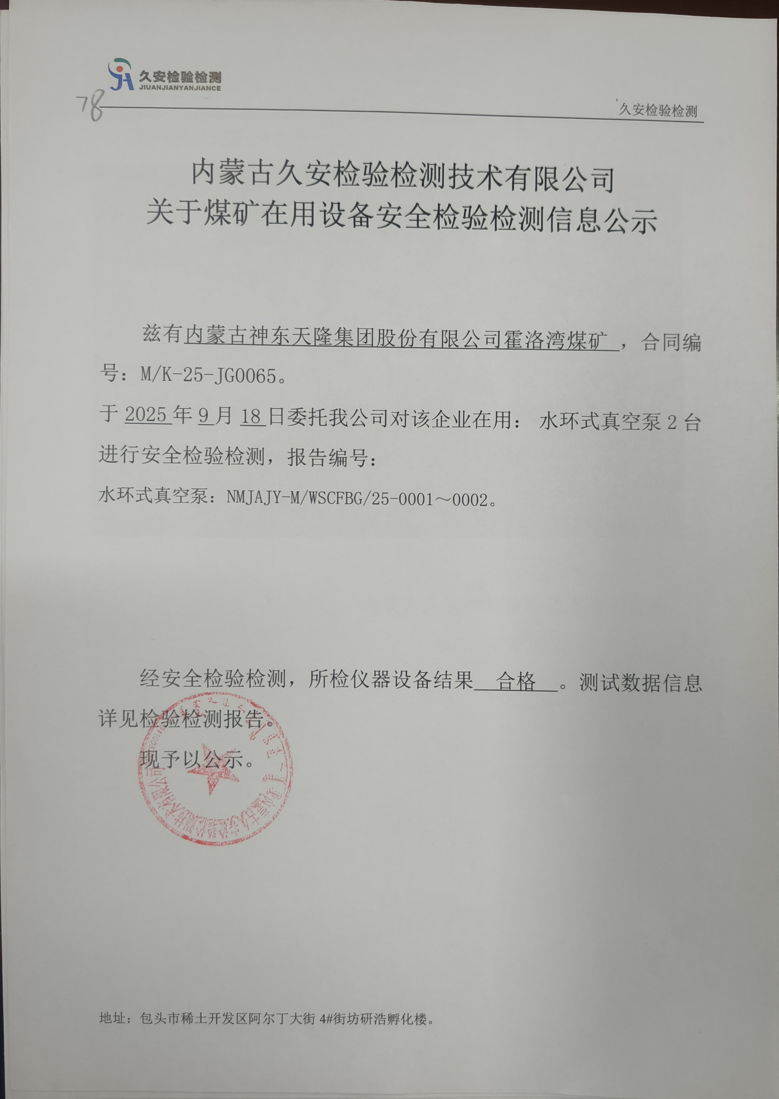 78.内蒙古自治区鄂尔多斯市伊金霍洛旗乌兰木伦镇煤矿在用设备安全检验检测信息公示