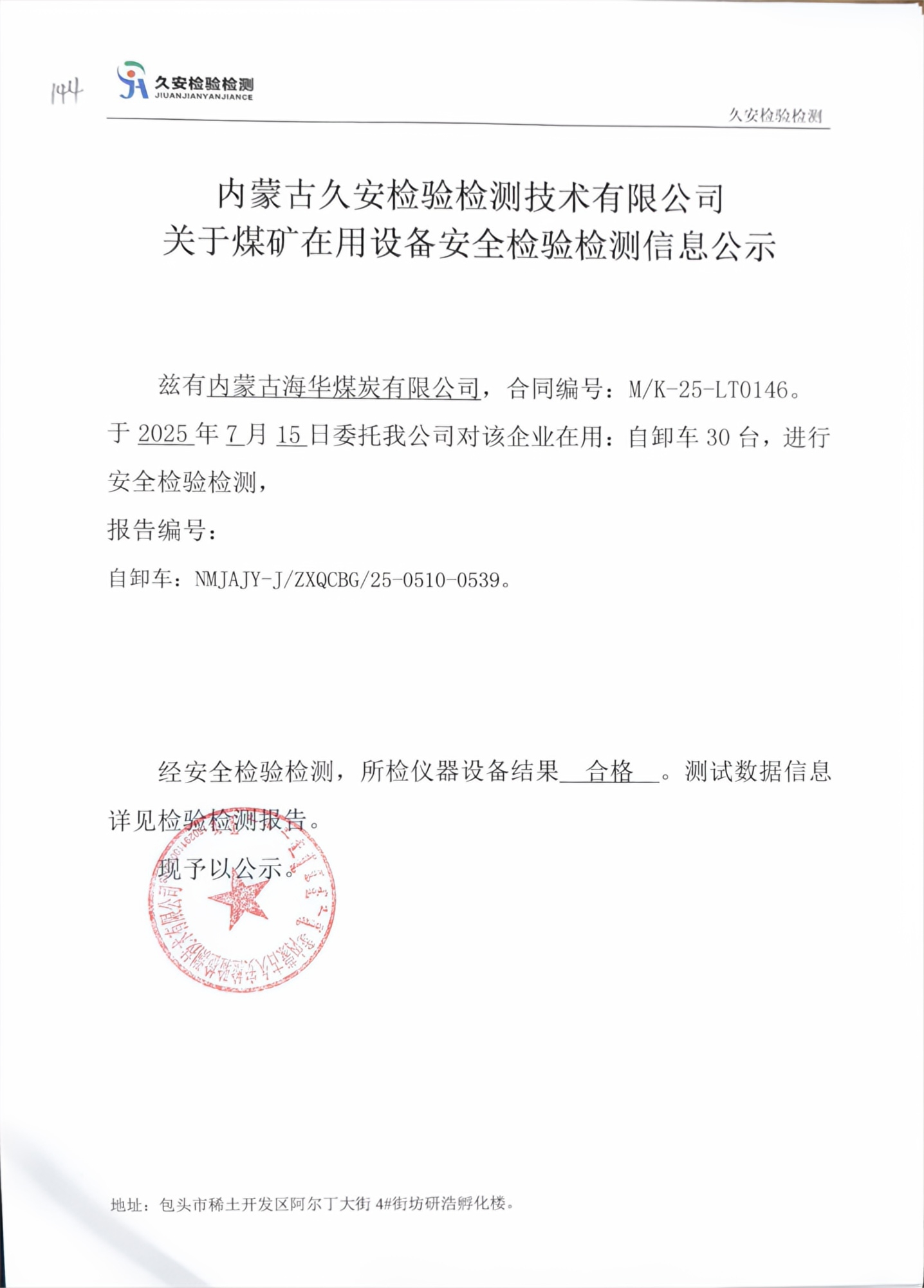 144.内蒙古海华煤炭有限公司煤矿在用设备安全检验检测信息公示