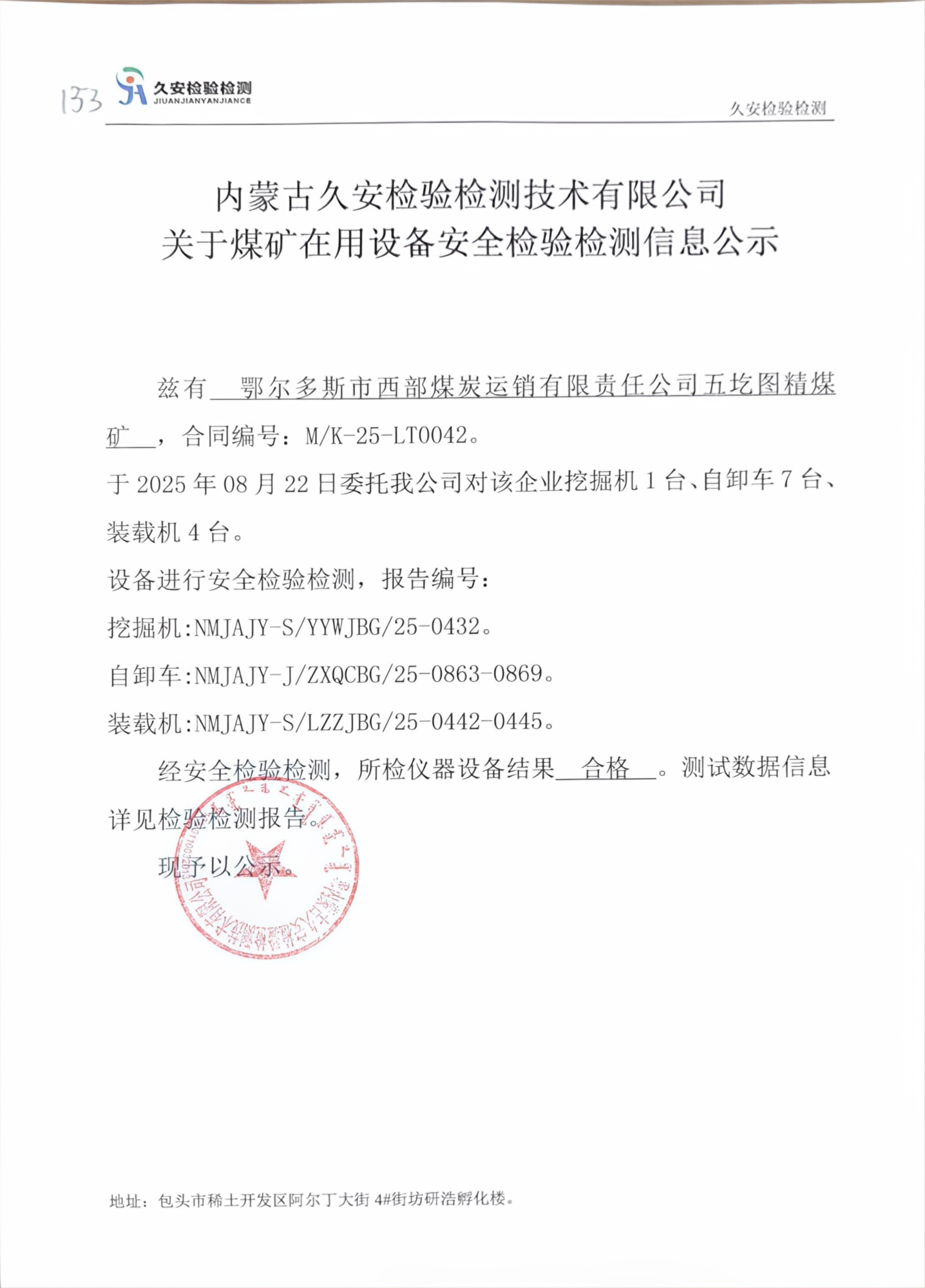 153.鄂尔多斯市西部煤炭运销有限责任公司五圪图精煤矿煤矿在用设备安全检验检测信息公示