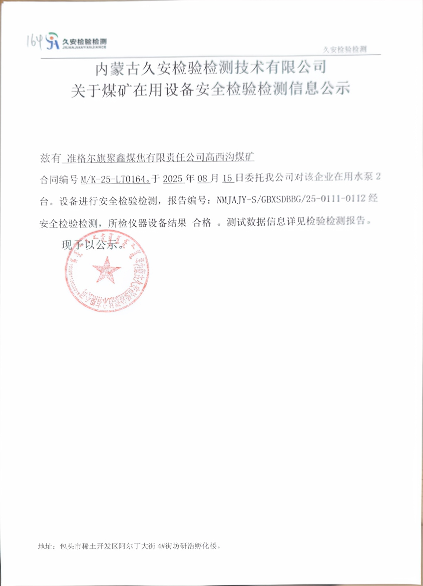 164.准格尔旗聚鑫煤焦有限责任公司高西沟煤矿煤矿在用设备安全检验检测信息公示