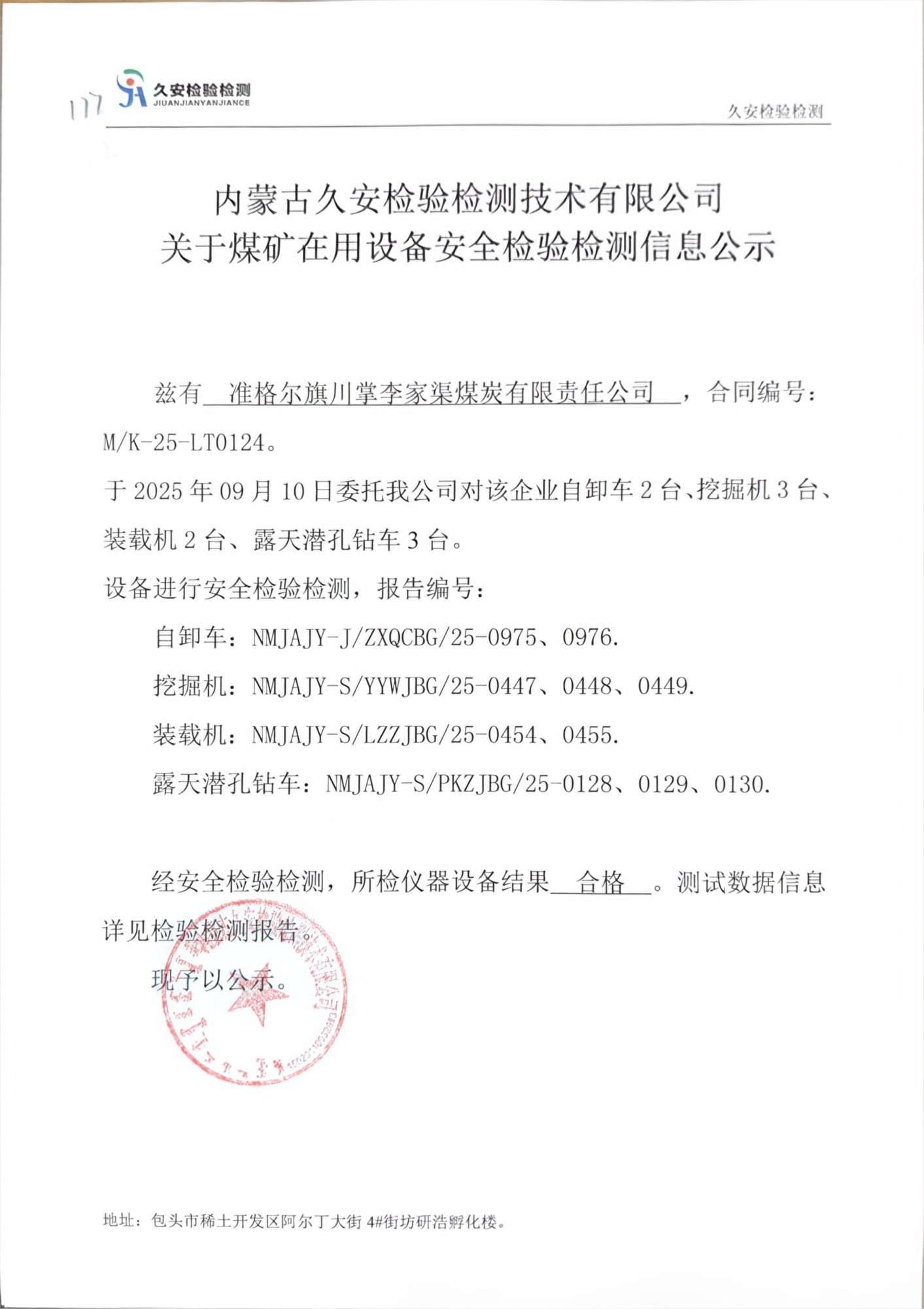 177.准格尔旗川掌李家渠煤炭有限责任公司煤矿在用设备安全检验检测信息公示