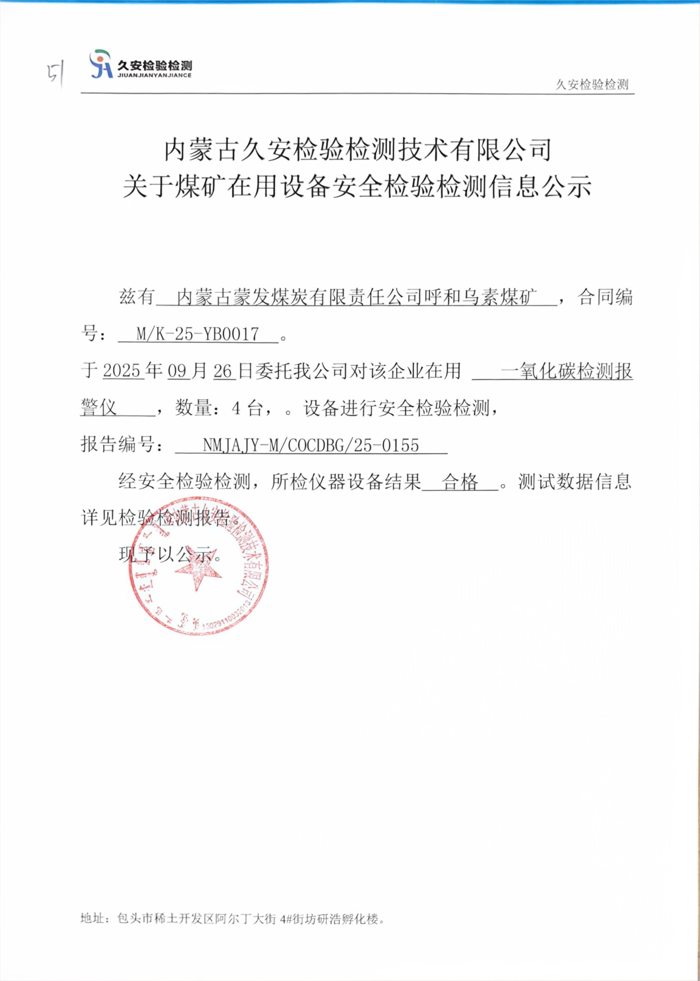 51.内蒙古蒙发煤炭有限责任公司呼和乌素煤矿煤矿在用设备安全检验检测信息公示