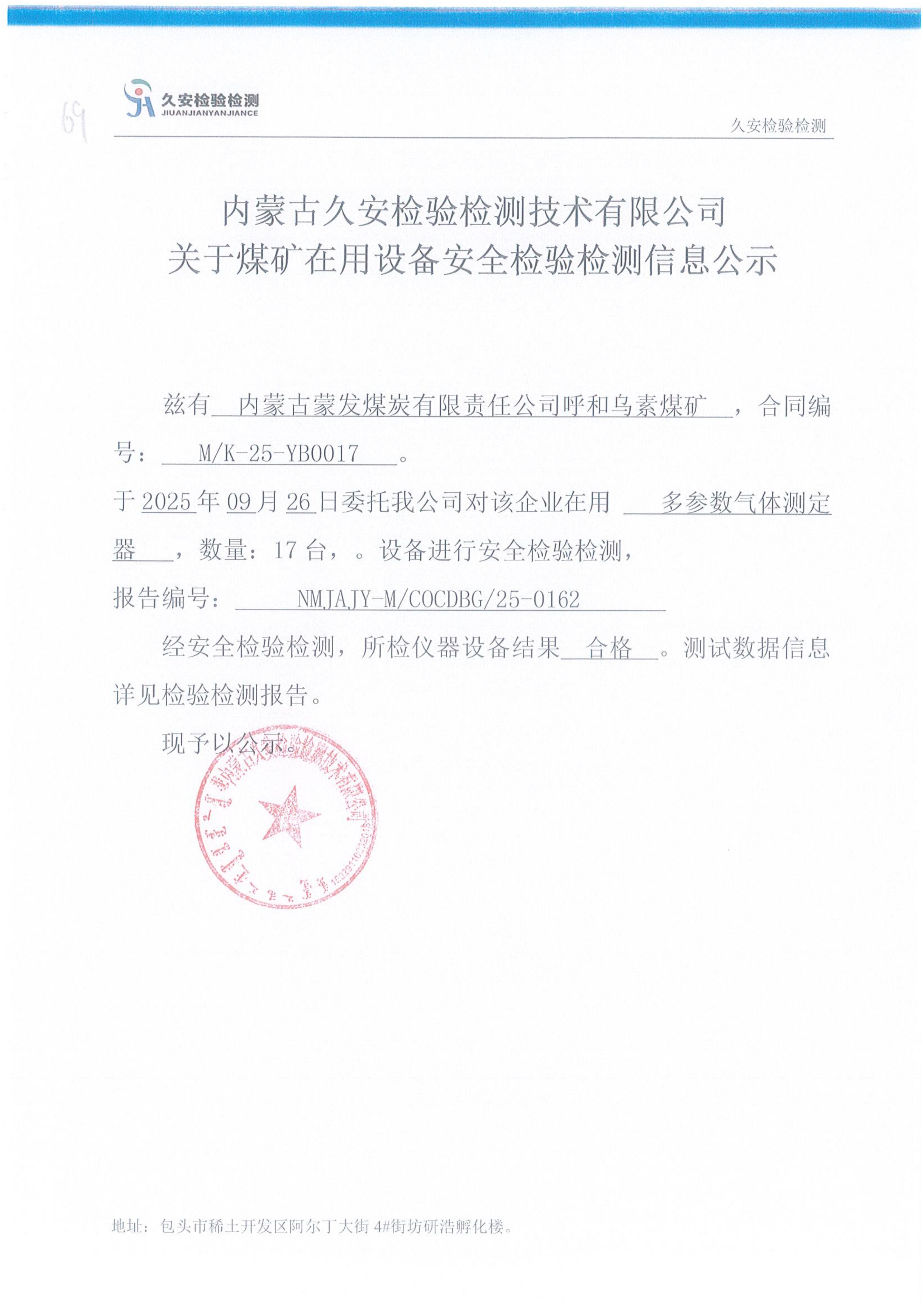 69.内蒙古蒙发煤炭有限责任公司呼和乌素煤矿在用设备安全检验检测信息公示
