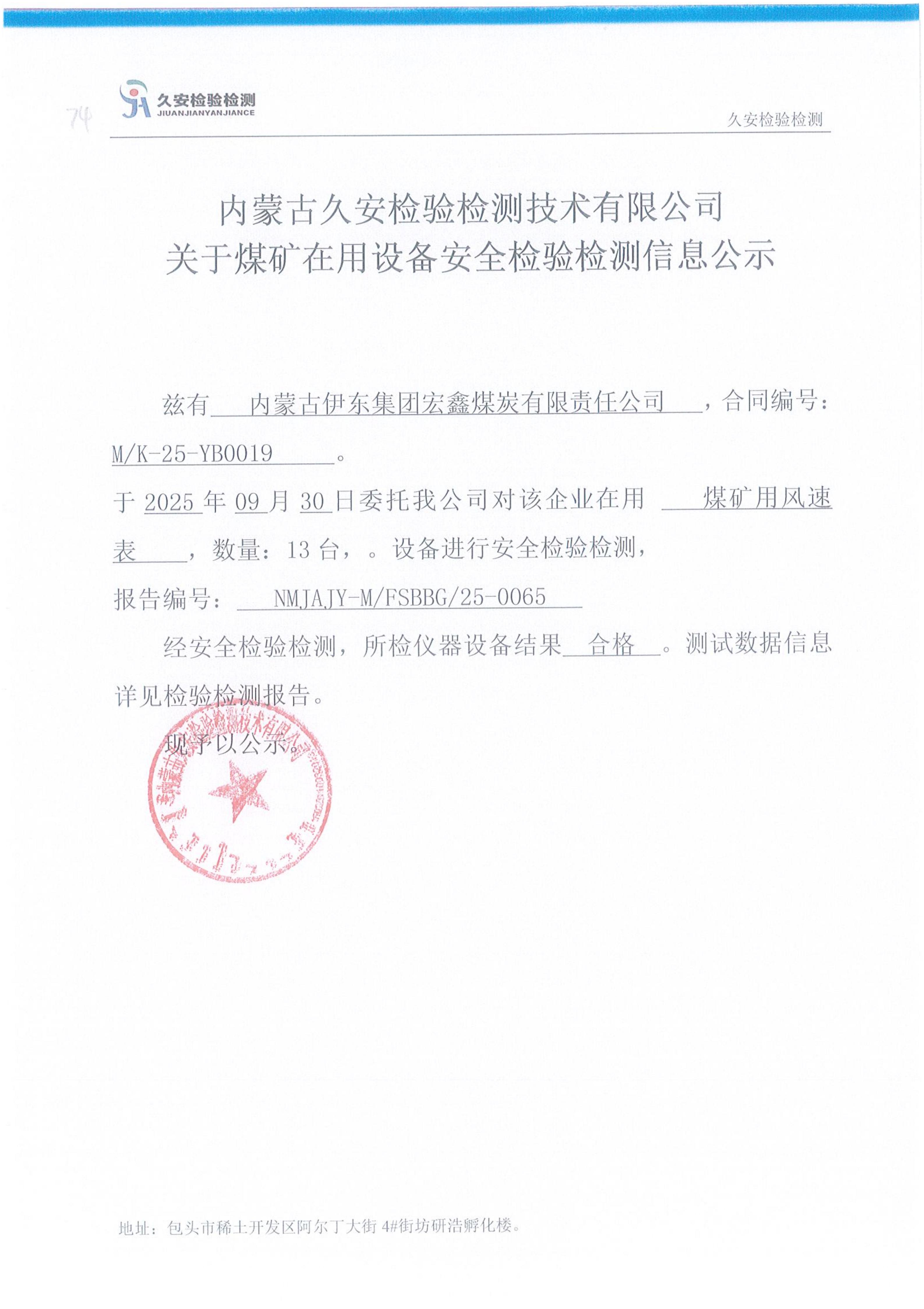 74.内蒙古伊东集团宏鑫煤炭有限责任公司煤矿在用设备安全检验检测信息公示