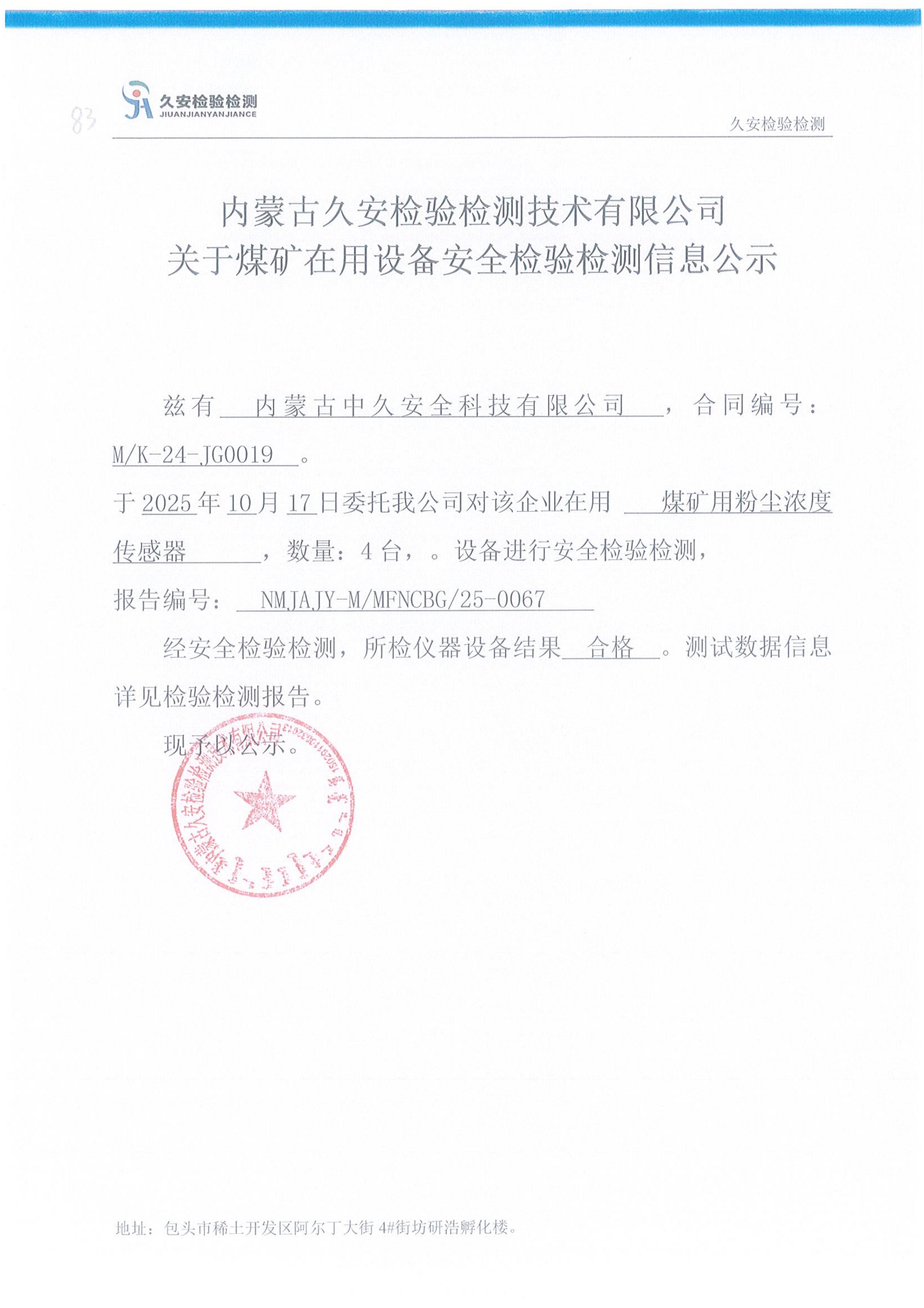83.内蒙古中久安全科技有限公司煤矿在用设备安全检验检测信息公示