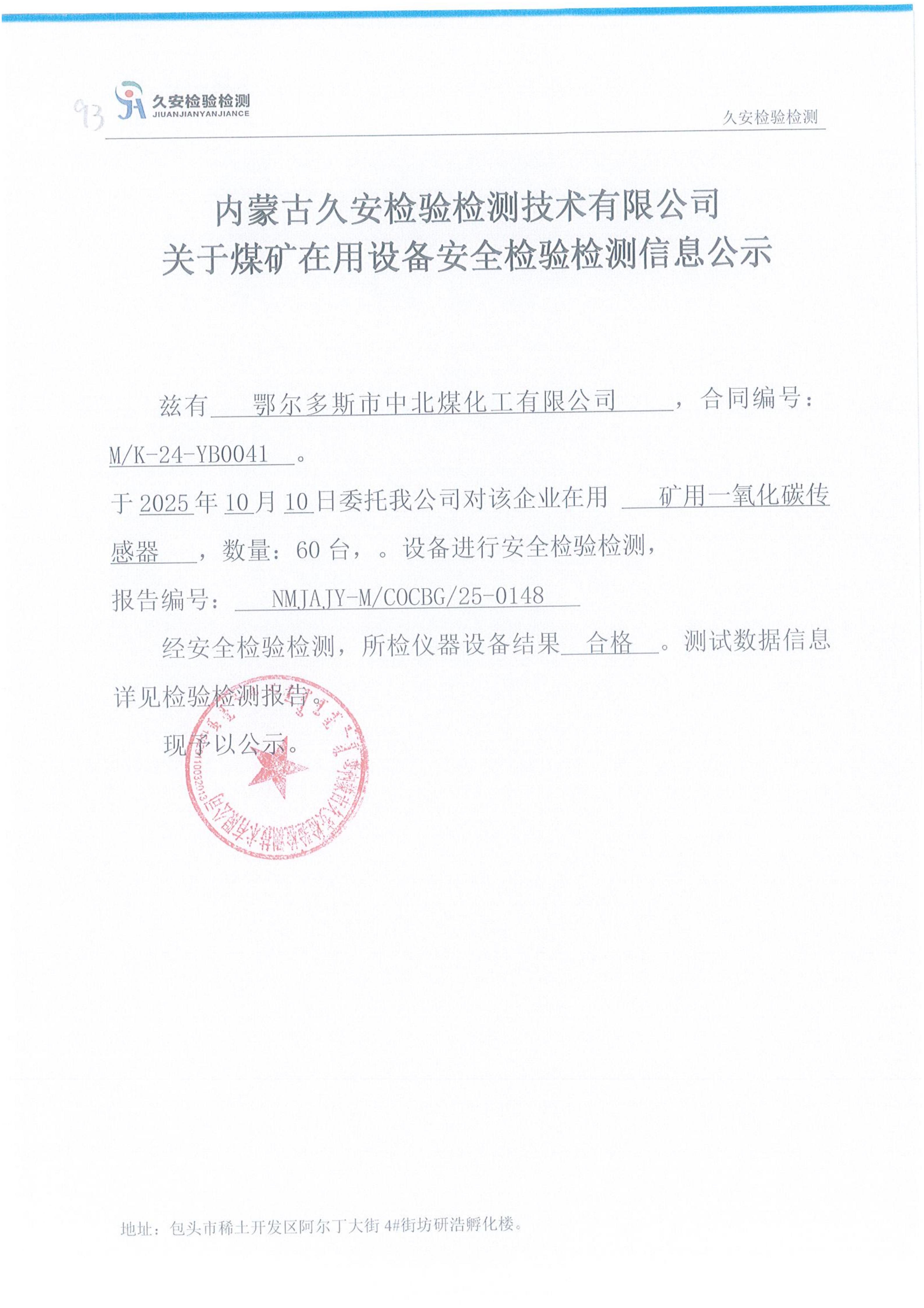 93.鄂尔多斯市中北煤化工有限公司煤矿在用设备安全检验检测信息公示
