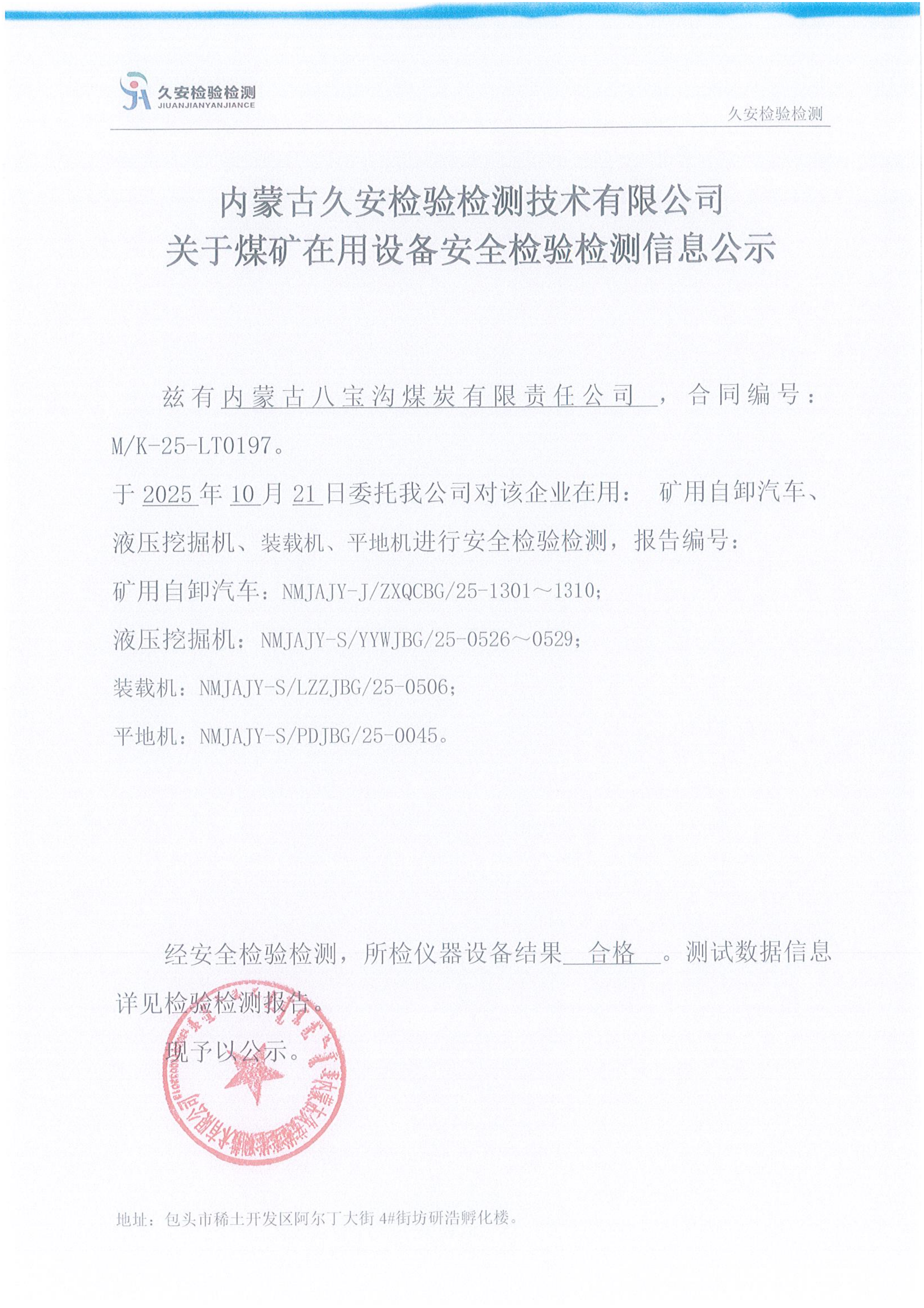 188.内蒙古八宝沟煤炭有限责任公司煤矿在用设备安全检验检测信息公示