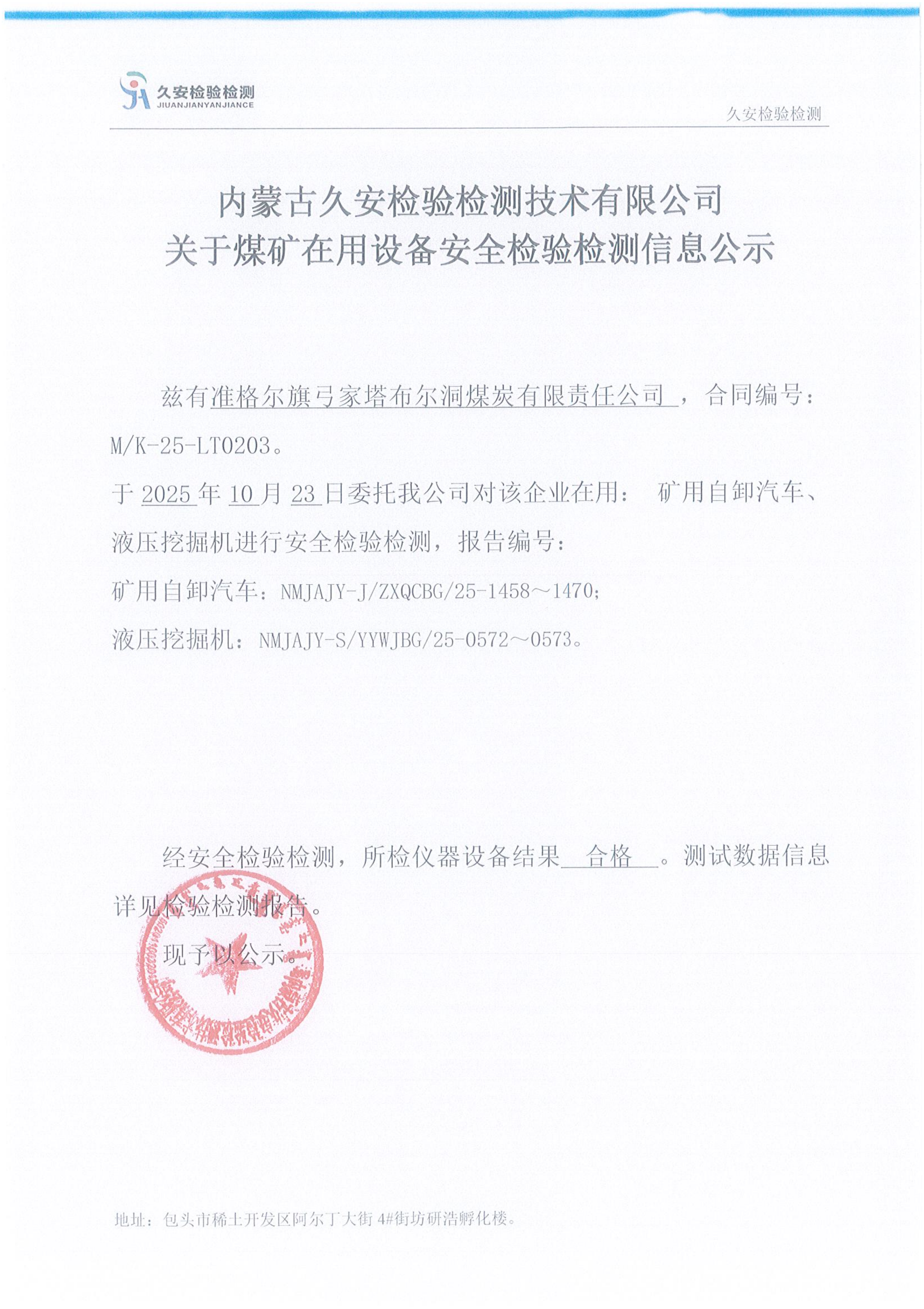 189.准格尔旗弓家塔布尔洞煤炭有限责任公司煤矿在用设备安全检验检测信息公示