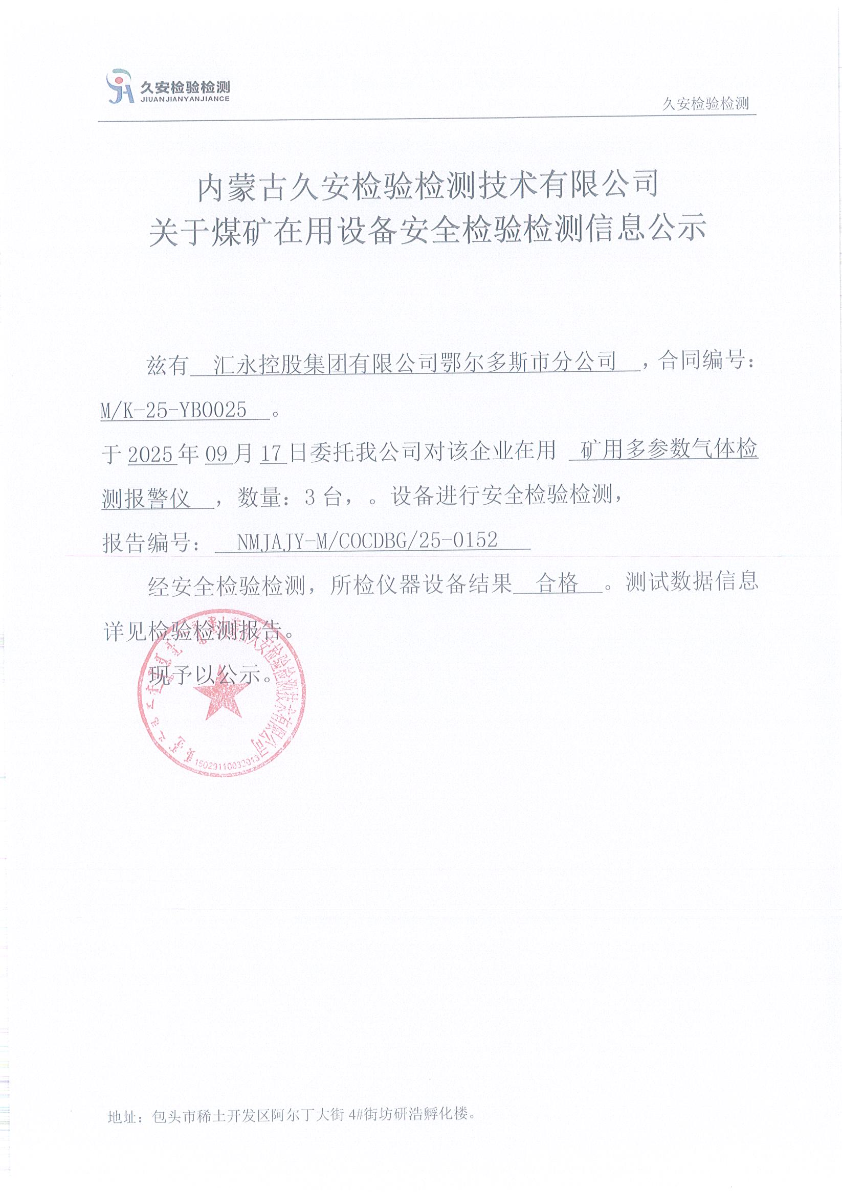 128、汇永控股集团有限公司鄂尔多斯市分公司煤矿在用设备安全检验检测信息公示