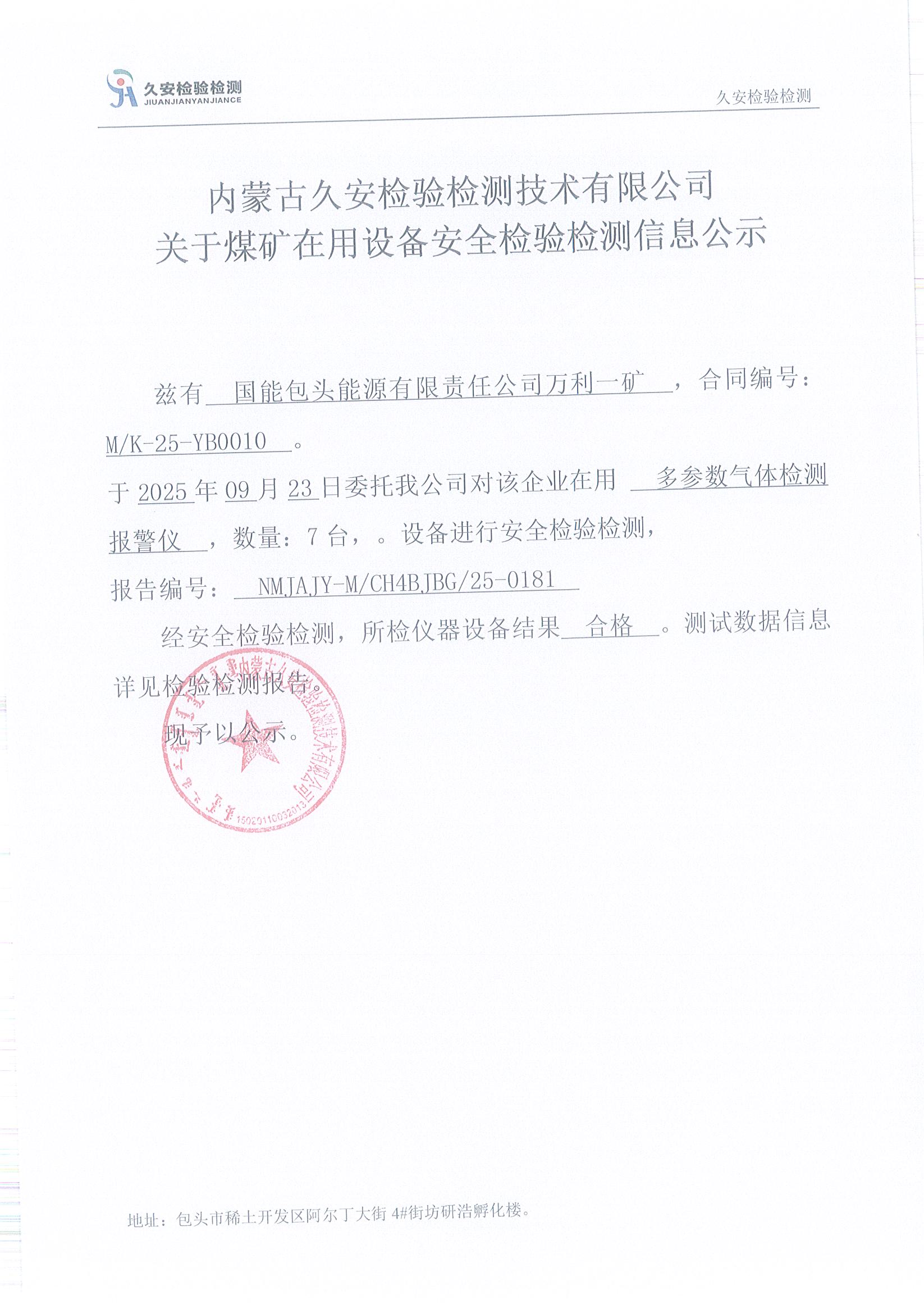 142、国能包头能源有限责任公司万利一矿煤矿在用设备安全检验检测信息公示