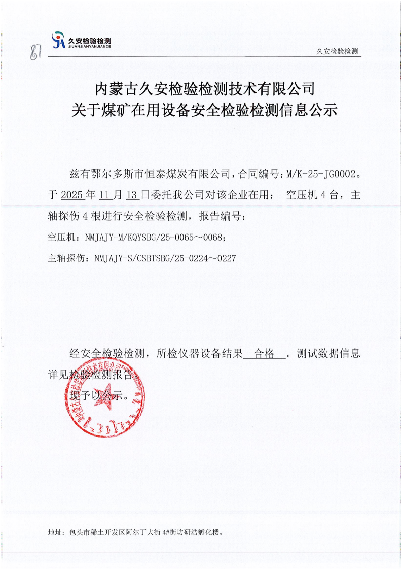 87.鄂尔多斯市恒泰煤炭有限公司煤矿在用设备安全检验检测信息公示