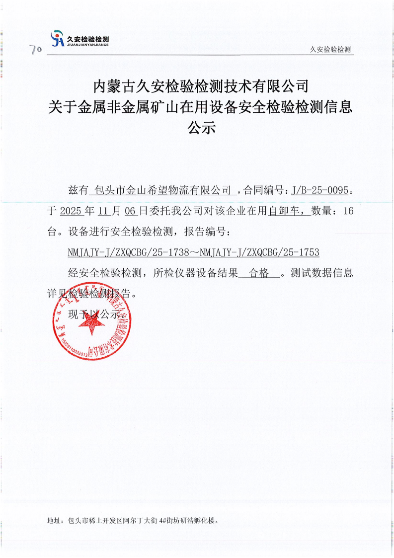 70.包头市金山希望物流有限公司金属非金属矿山在用设备安全检验检测信息公示