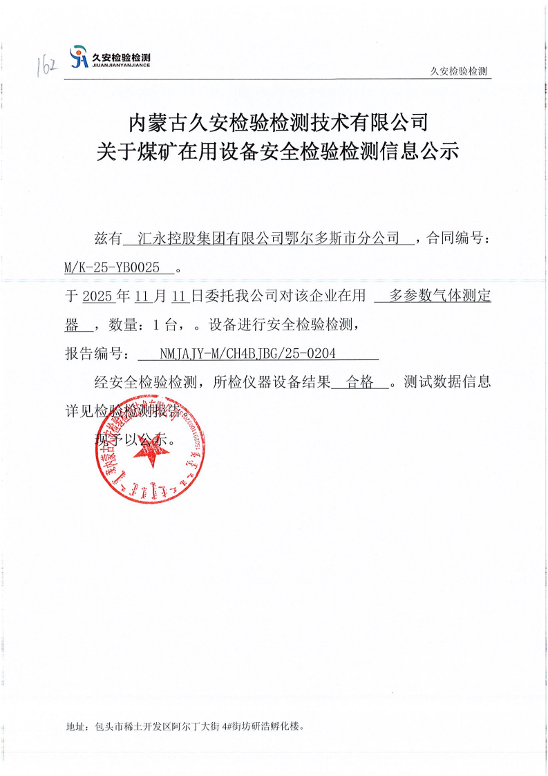 162.汇永控股集团有限公司鄂尔多斯市分公司煤矿在用设备安全检验检测信息公示
