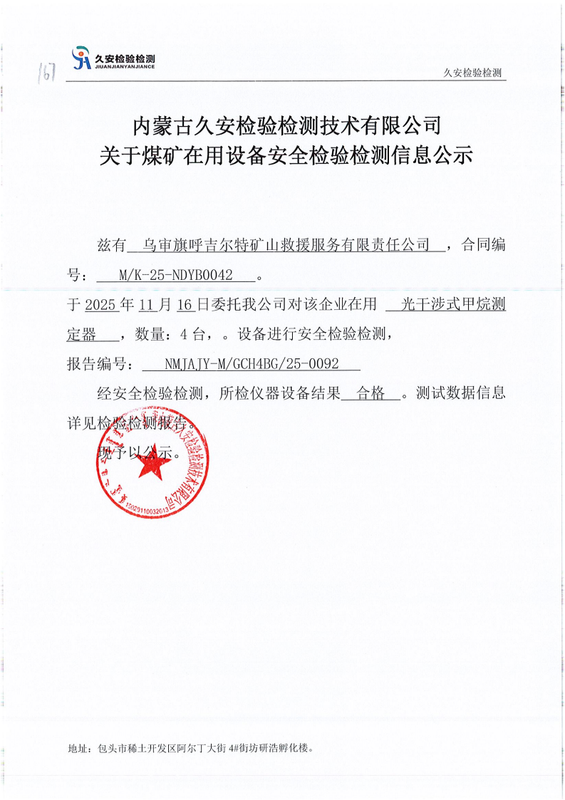 167.乌审旗呼吉尔特矿山救援服务有限责任公司煤矿在用设备安全检验检测信息公示
