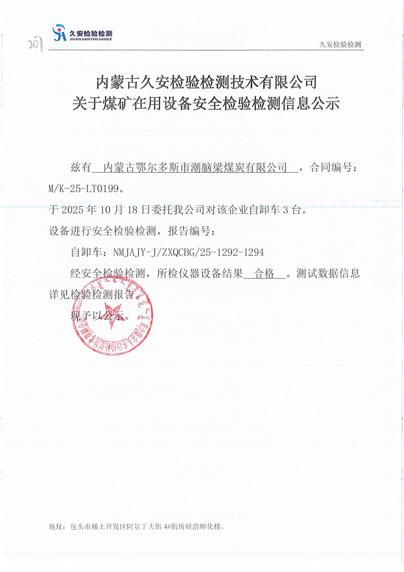 207.内蒙古鄂尔多斯市潮脑梁煤炭有限公司煤矿在用设备安全检验检测信息公示