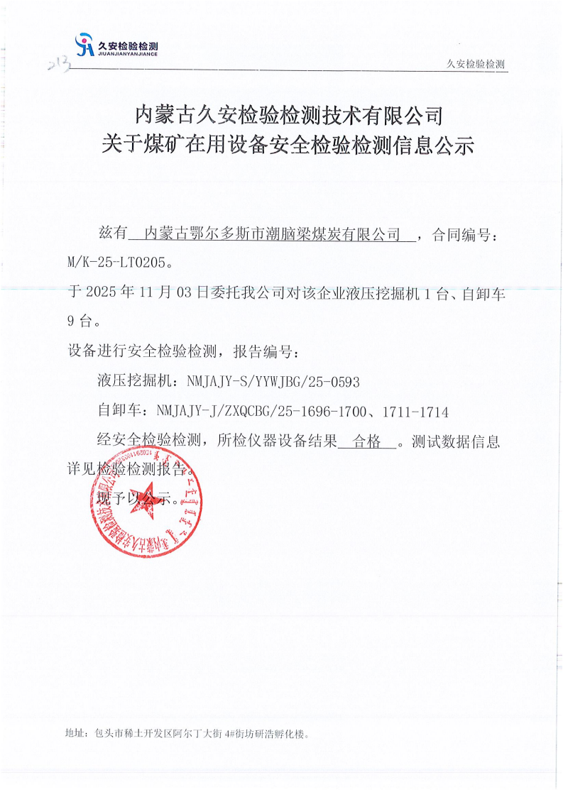 213.内蒙古鄂尔多斯市潮脑梁煤炭有限公司煤矿在用设备安全检验检测信息公示