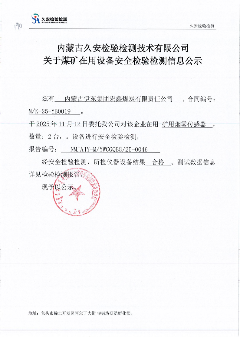 190.内蒙古伊东集团宏鑫煤炭有限责任公司煤矿在用设备安全检验检测信息公示